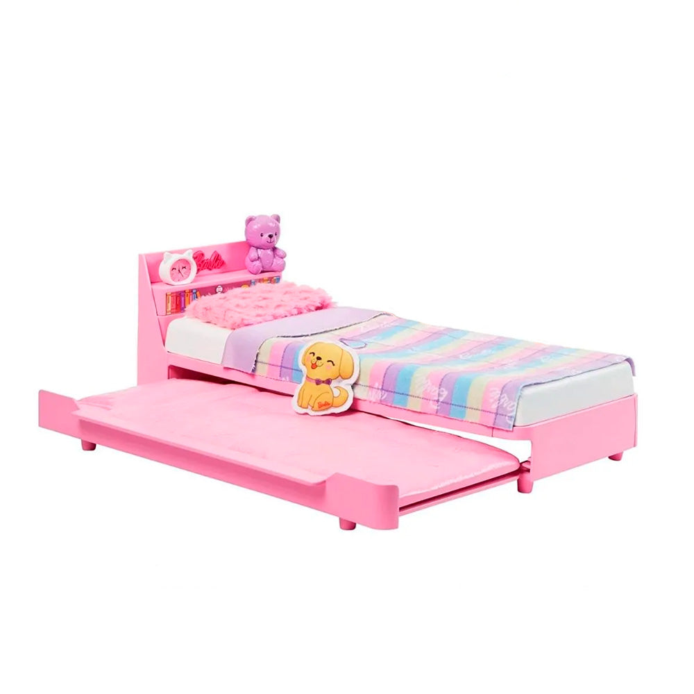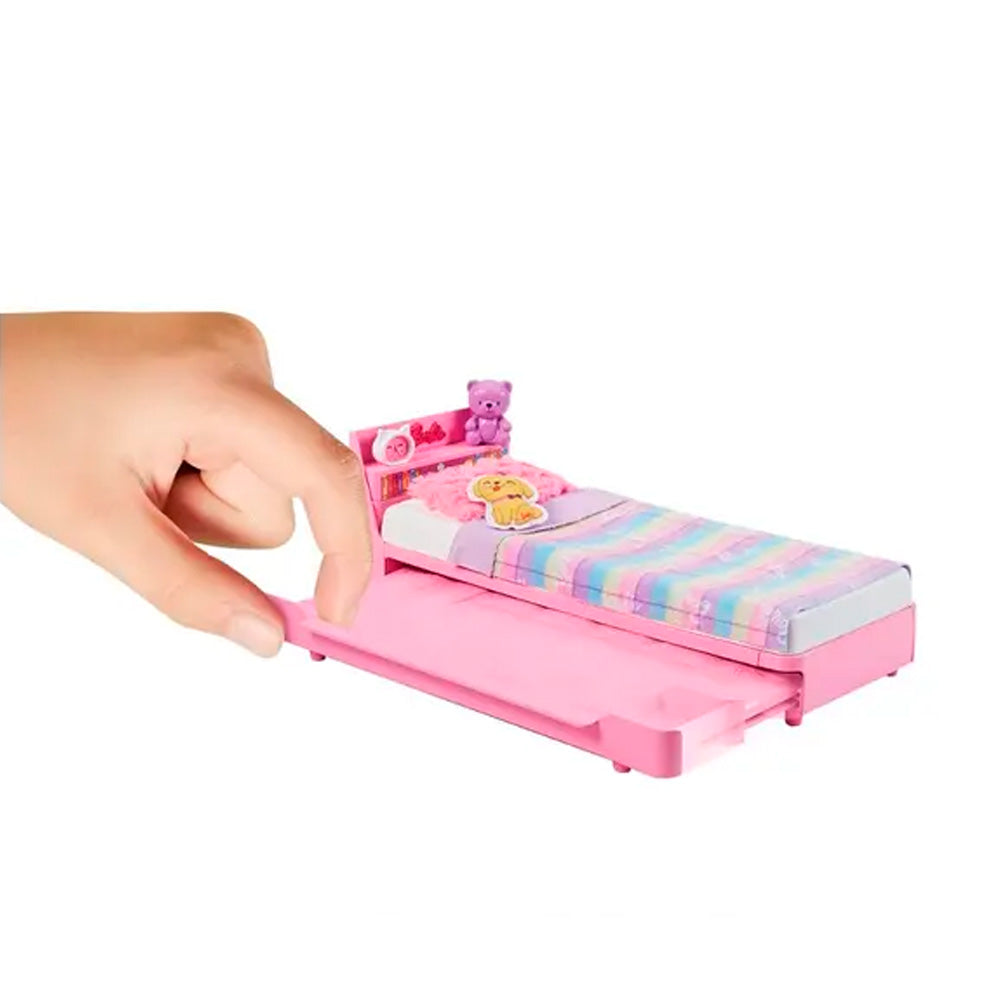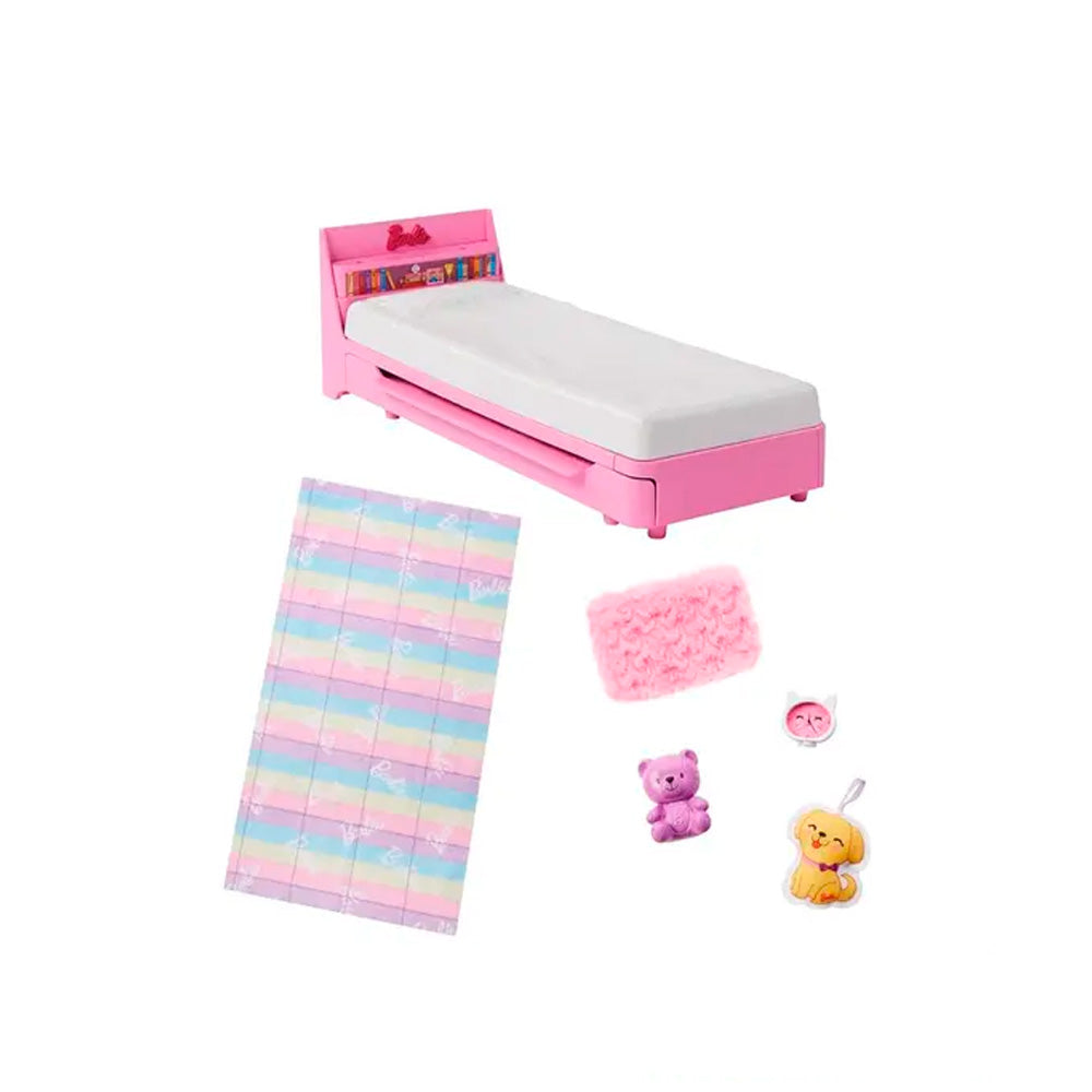 ¡My First BarbieTM es una nueva colección hecha para niños en edad preescolar! Tu juego para dormir cuenta con una cama nido en tonos rosa pastel con capacidad para dos muñecas de la colección My First BarbieTM. Una almohada suave, una manta y un perro de peluche añaden comodidad, mientras que los accesorios grandes como un osito de peluche y un reloj son perfectos para inspirar historias encantadoras y divertirse en una fiesta de pijamas.
