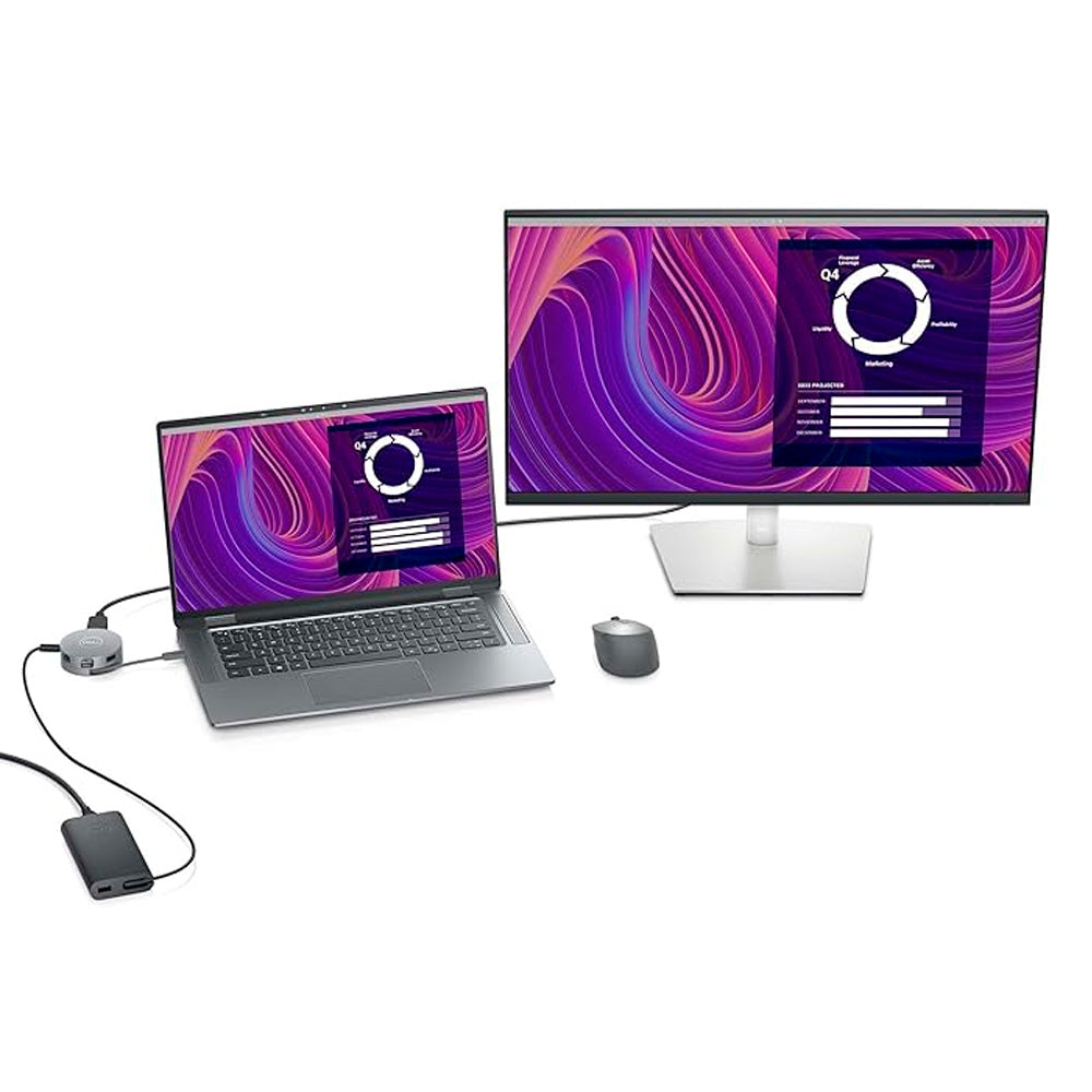 El adaptador multipuerto USB-C 6 en 1 Dell Portable - DA305 es un dispositivo compacto y versátil que te permite conectar tu portátil a varios dispositivos. Conectividad de vídeo, red y datos: puedes conectar tu portátil a monitores, proyectores, auriculares, teclado, ratón, unidades flash y otros accesorios con los puertos USB-A, USB-C, HDMI, DisplayPort y RJ-45 que ofrece el adaptador.