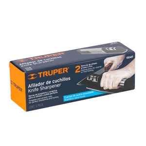 Es ideal para mantener tus cuchillo de hojas lisas afilados, con cuerpo de acero inoxidable con soportes de ABS y base antiderrapante, contiene 2 nicveles de afilado grueso y fino, contiene hojas de carburo de tungsteno ideal para cuchillos con filo completamente desgastados y el otro nivel es hojas de cerámicas ideal para perfilado y pulido de cuchillos.
