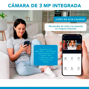 - Cámara Integrada: Monitoriza a tu mascota en tiempo real con la cámara HD integrada. Captura fotos y videos, y mantente conectado con tu mascota cuando estés fuera.