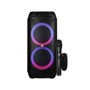 El Rave 80 cuenta con 800 vatios de potencia de sonido y tecnología de bajos de alta gama. Incluye dos bocinas de 8", efectos de iluminación, una batería de 3600 mAh e incluye un micrófono inalámbrico. Fácil de transportar gracias a su asa. Si necesitas más potencia, activa la función TWS y empareja un segundo altavoz para duplicar la potencia y la diversión. Este altavoz también incluye dos entradas de micrófono y una de guitarra para disfrutar aún más del karaoke.