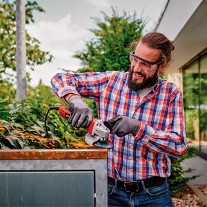 La potente potencia de 750 W proporciona una gran cantidad de energía a la rueda de corte para velocidades de hasta 12.000 revoluciones por minuto. La seguridad del usuario es una prioridad, por lo que cuenta con un protector de rueda especialmente diseñado. El seguro de reinicio también añade una importante seguridad adicional durante el uso. El sistema de bloqueo del husillo permite cambiar la herramienta de forma fácil y cómoda. Para que el usuario tenga flexibilidad durante el funcionamiento, hay un cabezal de engranaje metálico. La empuñadura adicional puede colocarse en dos posiciones diferentes, por lo que amplía la gama de aplicaciones y permite un manejo ergonómico. El diámetro de la rueda es de 115 milímetros. El disco de corte deseado está disponible por separado.