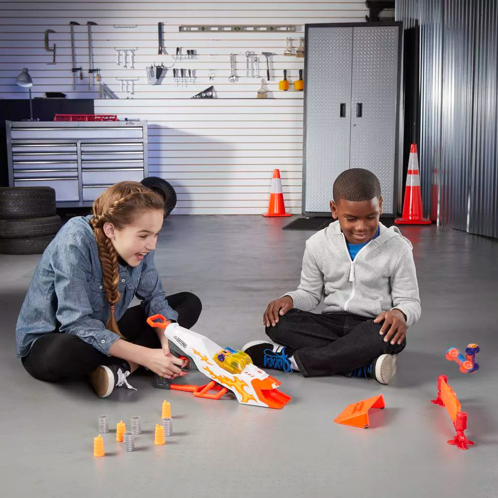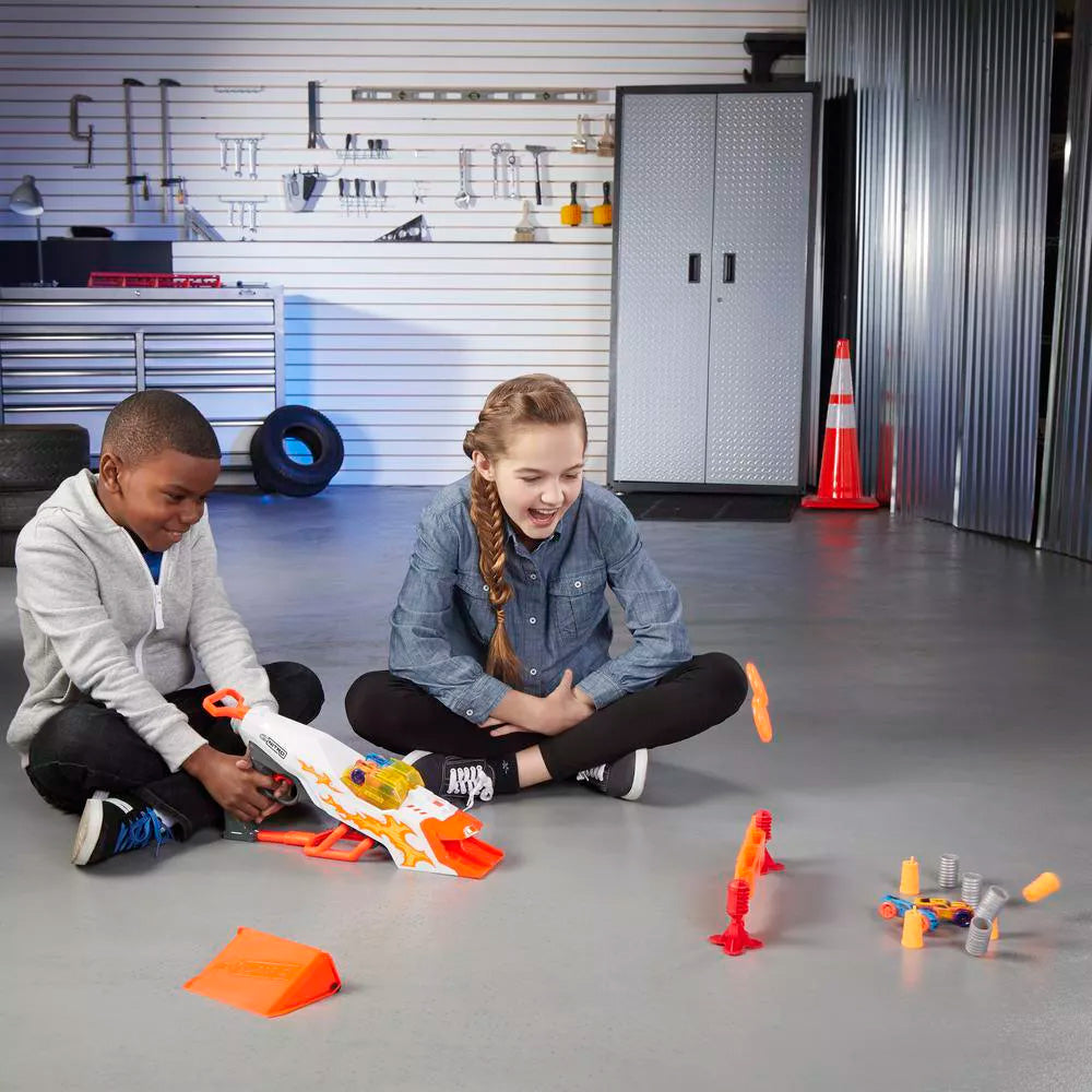 Este juego Nerf Nitro cuenta con un desintegrador de 2 cañones para que los niños puedan lanzar 2 autos a la vez. Configura el objetivo doble reactivo y lanza los autos con carrocería de espuma hacia la barrera; el impacto envía los 2 discos volando por el aire.