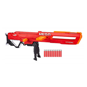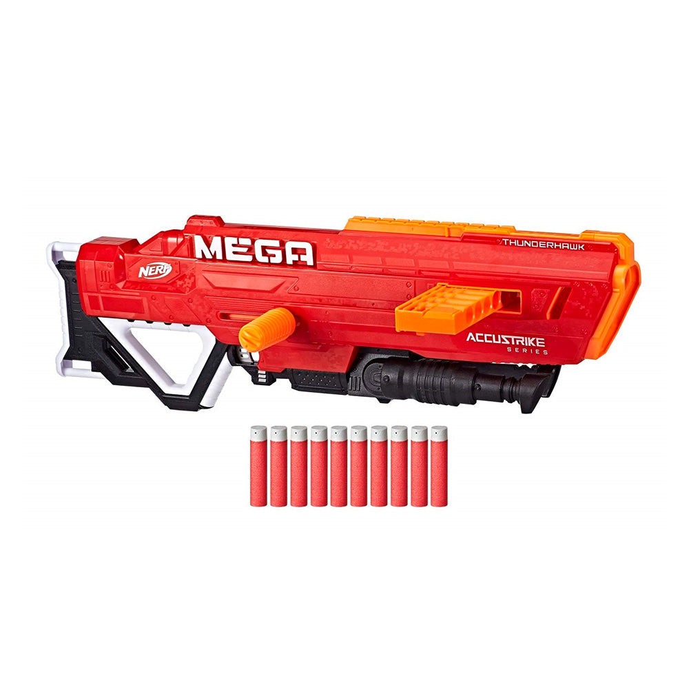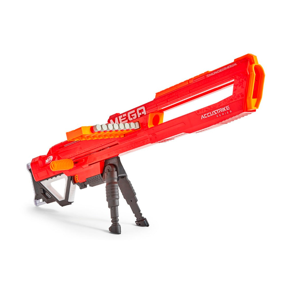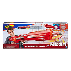 Explosión a lo grande con el lanzador Nerf Mega Thunderhawk. Con 41,5 pulgadas (1 metro), este es el lanzador Nerf Mega más largo y el primer lanzador Nerf Mega AccuStrike. La extensión del cañón se desliza hacia adelante y hacia atrás en la parte superior del desintegrador, por lo que los niños pueden extenderlo para apuntar a distancia y retraerlo para obtener un desintegrador más compacto. Tomas estables con el bípode abatible.
