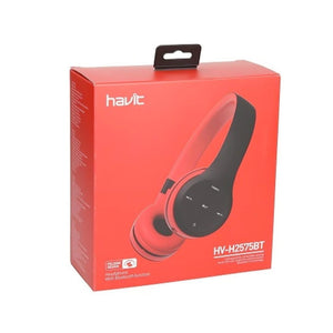 Audifonos Havit Bluetooth 4.2 Entrada Auxiliar con Botones Subir Bajar Volumen Contestar Cambiar cancion Funcion Radio FM Micro SD color negro+rojo HV-H2575BT