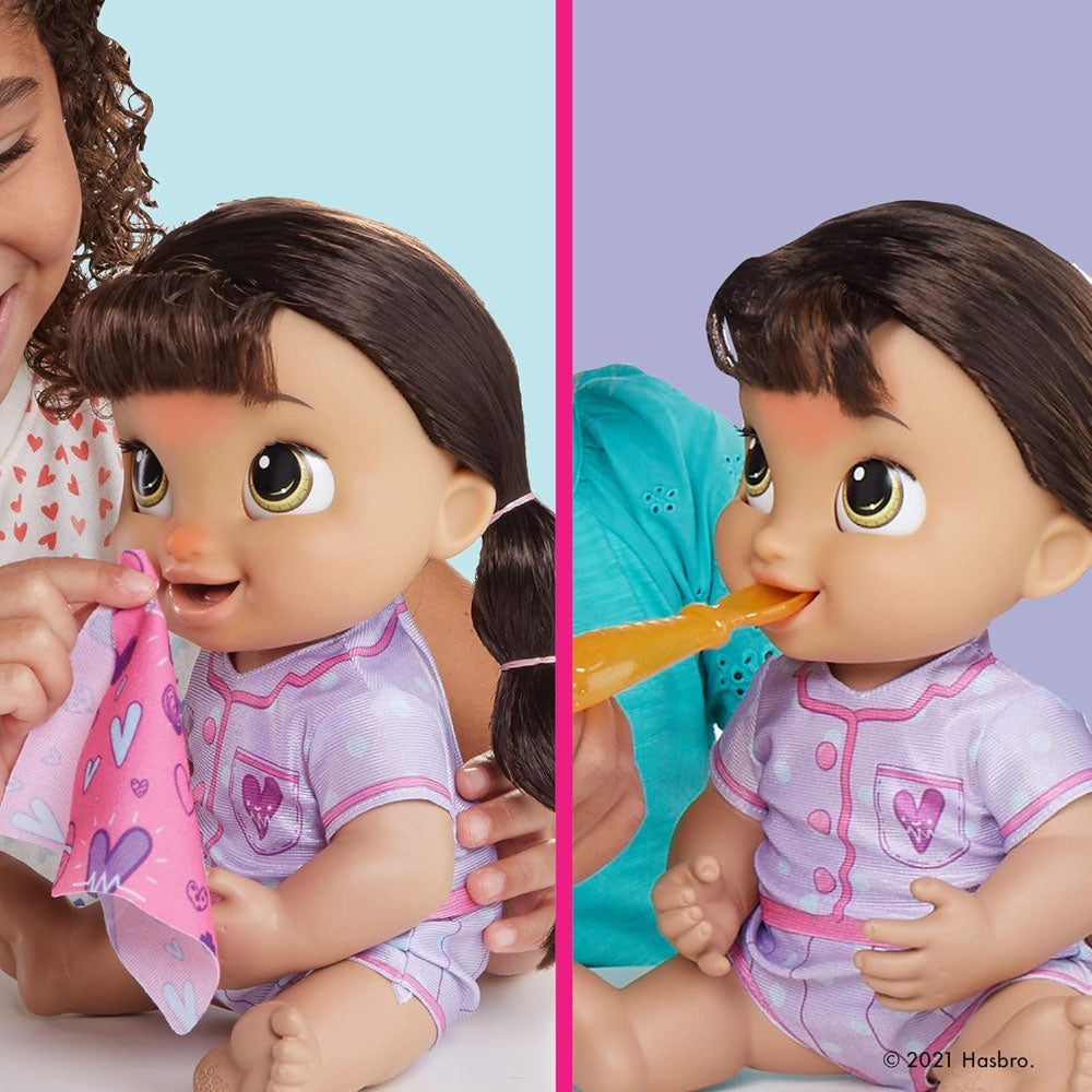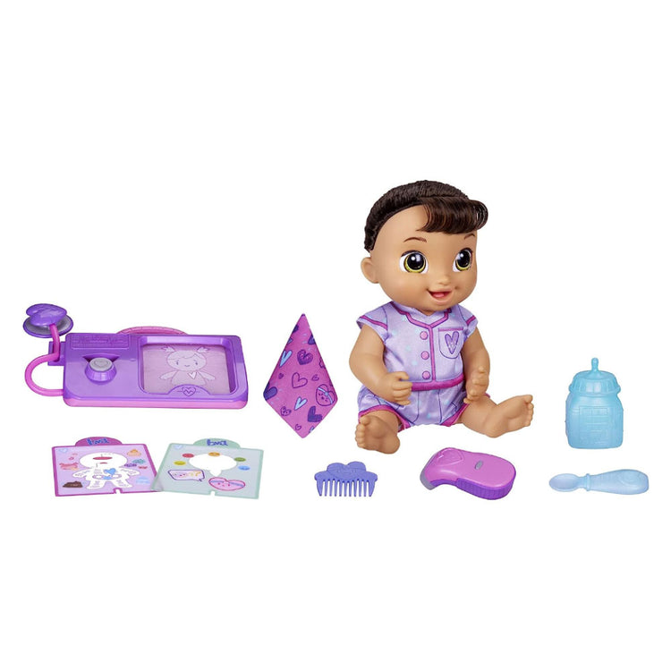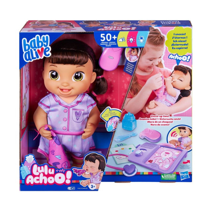 La muñeca Baby Alive Lulu Achoo estornuda y mueve sus manos hacia su cara Cuando no está bien, hace sonidos y su nariz y frente se iluminan en rojo. La estación médica te dice cuál es el asunto y cómo hacer que Lulu Achoo se sienta mejor.