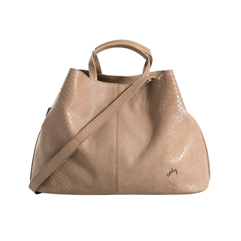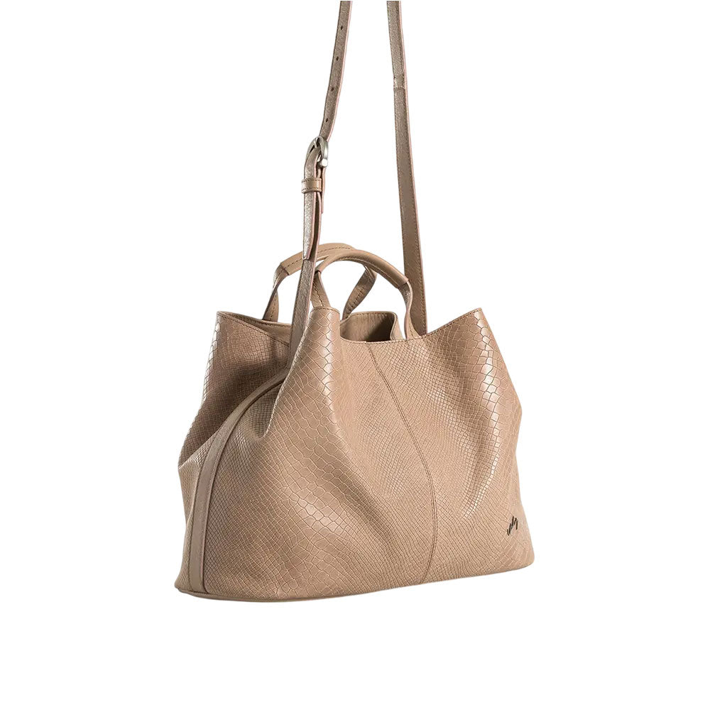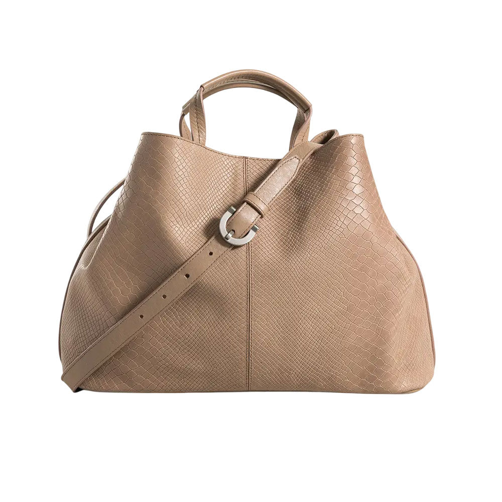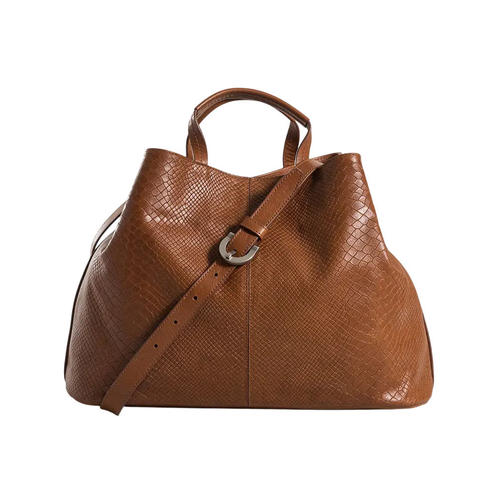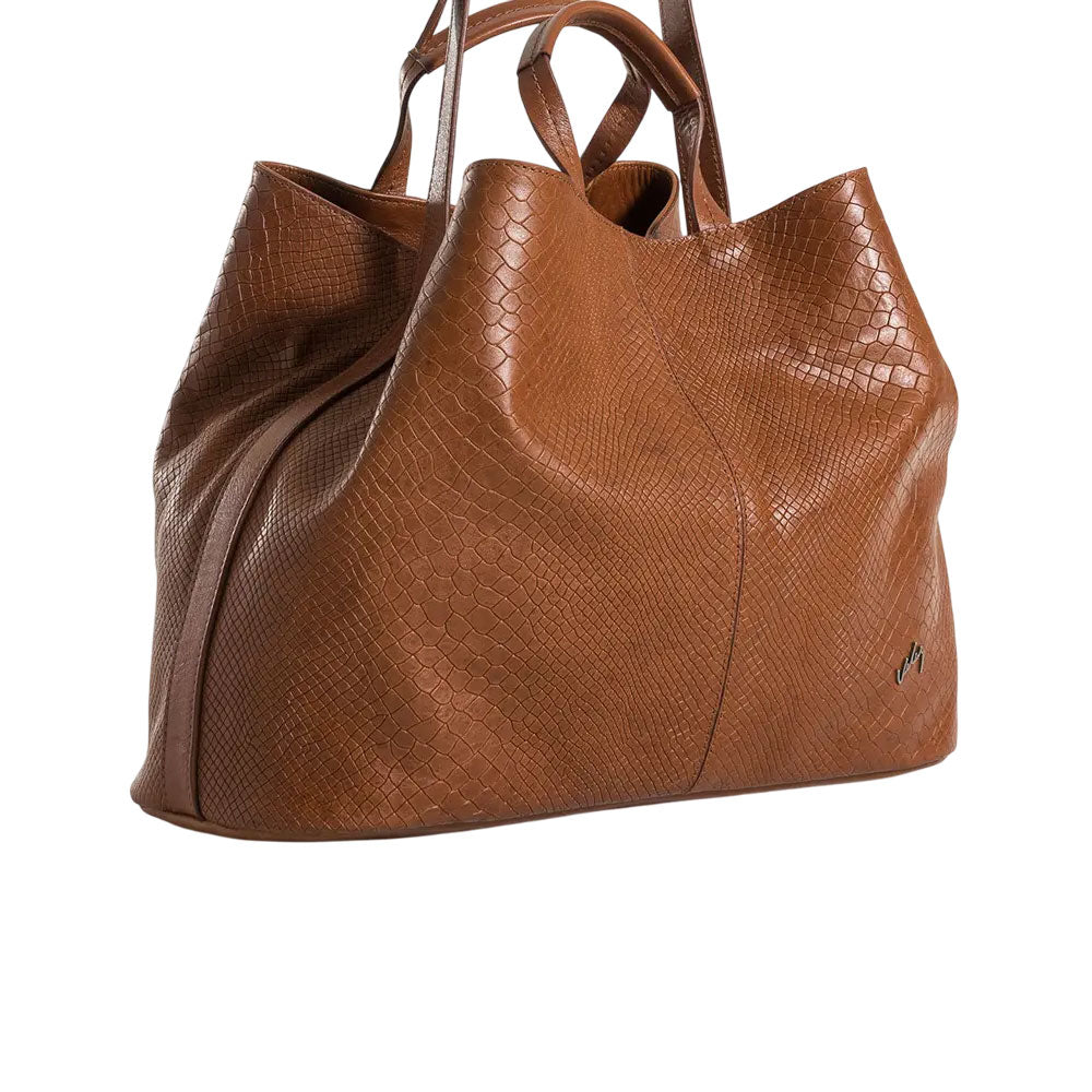 Nuestro bowling de cuero grabado es una pieza versátil, cómoda y funcional, de gran capacidad interna para todos los elementos que necesitas a diario. En su interior encuentras un bolsillo interno con cremallera y un bolsillo plano porta celular. Su cargadera está elaborada en cuero con sistema ajustable, este bowling cierra por medio de broche. Su grabado está inspirado en la textura de piel de serpiente, que le otorga sofisticación y textura, perfecto para la oficina o incluso tus escapadas viajeras.