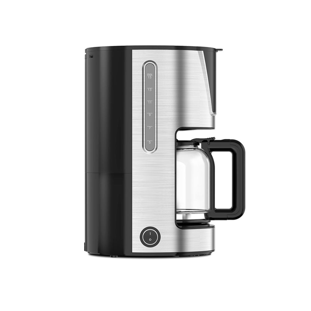 La cafetera de 900 Watts es ideal para preparar grandes cantidades de café, con una capacidad de 15 tazas o 1.5 litros, perfecta para reuniones o familias grandes. Su filtro lavable y porta filtro permiten una experiencia de uso más conveniente y ecológica. Incorpora una placa calentadora para mantener el café a la temperatura ideal durante más tiempo. El dispositivo anti goteo evita derrames al retirar la jarra, manteniendo tu espacio limpio. Además, cuenta con un indicador de nivel de agua para una preparación precisa, y su interruptor de encendido/apagado tiene un indicador luminoso azul, que te muestra cuando está funcionando. El tarro de cristal resistente a altas temperaturas garantiza durabilidad, mientras que su inyección de color con decoración SUS le da un toque elegante y moderno.