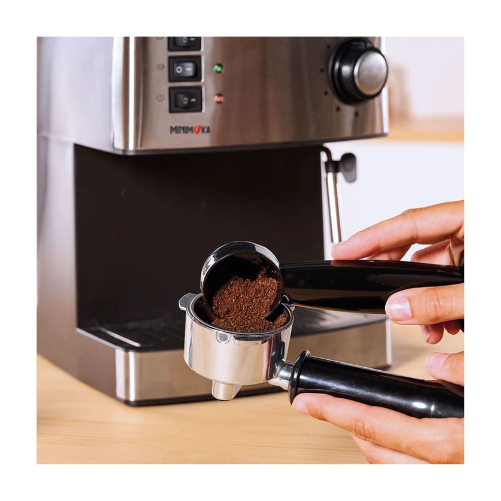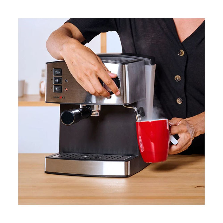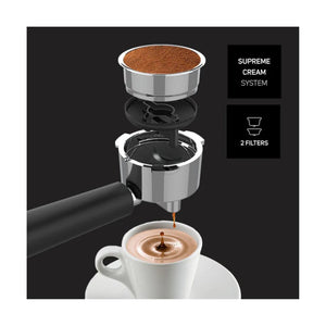 Disfruta de un café delicioso y profesional en casa con esta cafetera de 850W. Con una bomba de presión de 15 bar, te garantiza un espresso con la mejor crema y sabor. Su nivel de agua visible con capacidad de 1,6L te permite monitorear fácilmente la cantidad de agua, mientras que el vaporizador te ofrece la posibilidad de calentar y espumar leche para preparar tus bebidas favoritas. Gracias a su cebador automático y portafiltros de aluminio, la preparación es rápida y eficiente. Incluye 2 cacillos de acero inoxidable con filtro Extra Cream incorporado para un café más cremoso. Además, su bandeja calienta tazas y funcionamiento silencioso completan una experiencia de café superior.