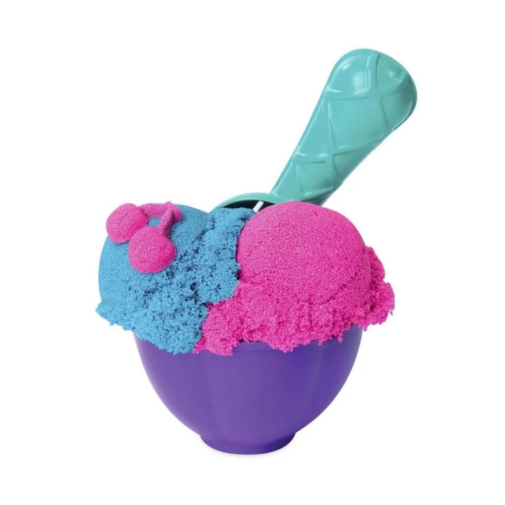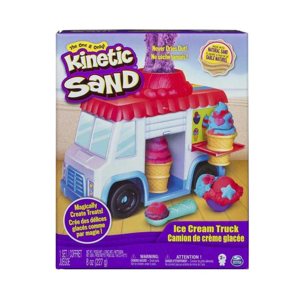 La arena nunca se seca para que puedas usarla una y otra vez. Viene con 8 oz de arena y todos los accesorios y moldes que necesitas para crear y mostrar conos de helado. ¡Personaliza con toppings y mezcla dos colores de arena para crear un nuevo color! El camión de helado de arena Kinetic hace que sea fácil crear deliciosos golosinas. Coloque un cono en el camión, llene la parte superior del camión con arena, gire el mango y vea cómo el helado gira mágicamente en el cono!