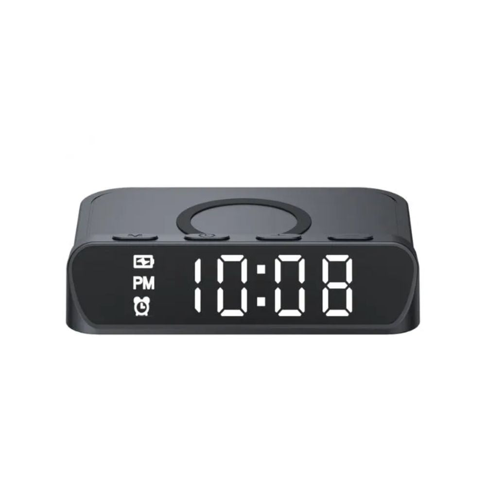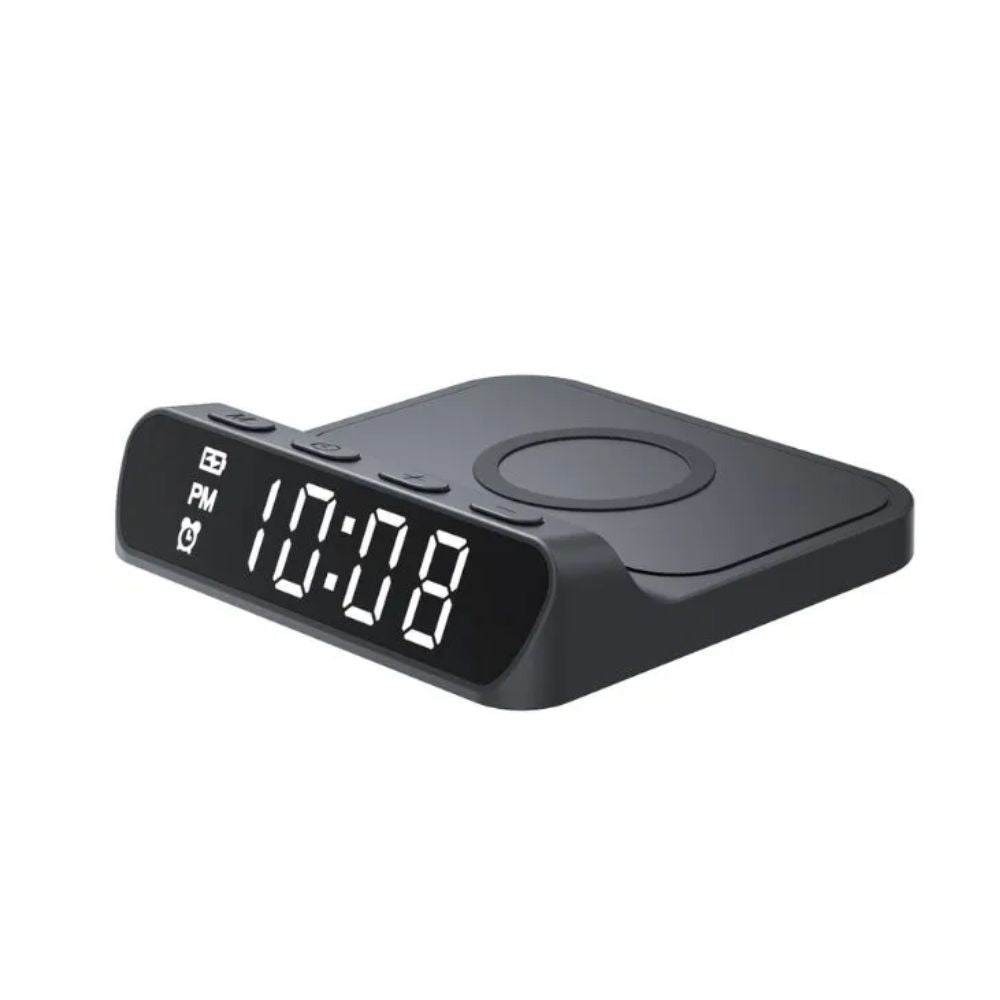 El Cargador Inalámbrico con Reloj combina practicidad y estilo en un solo dispositivo. Con una potencia de hasta 15W de carga rápida inalámbrica (compatible con 10W, 7.5W y 5W), ofrece una carga eficiente y segura para tus dispositivos móviles. Además, integra un reloj despertador digital, ideal para tu mesa de noche u oficina, brindando funcionalidad doble en un diseño moderno y compacto.