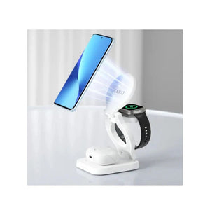 Este cargador inalámbrico 3 en 1 es la solución perfecta para mantener tus dispositivos cargados de manera rápida y conveniente. Compatible con teléfonos, relojes y audífonos, todo en un solo lugar.