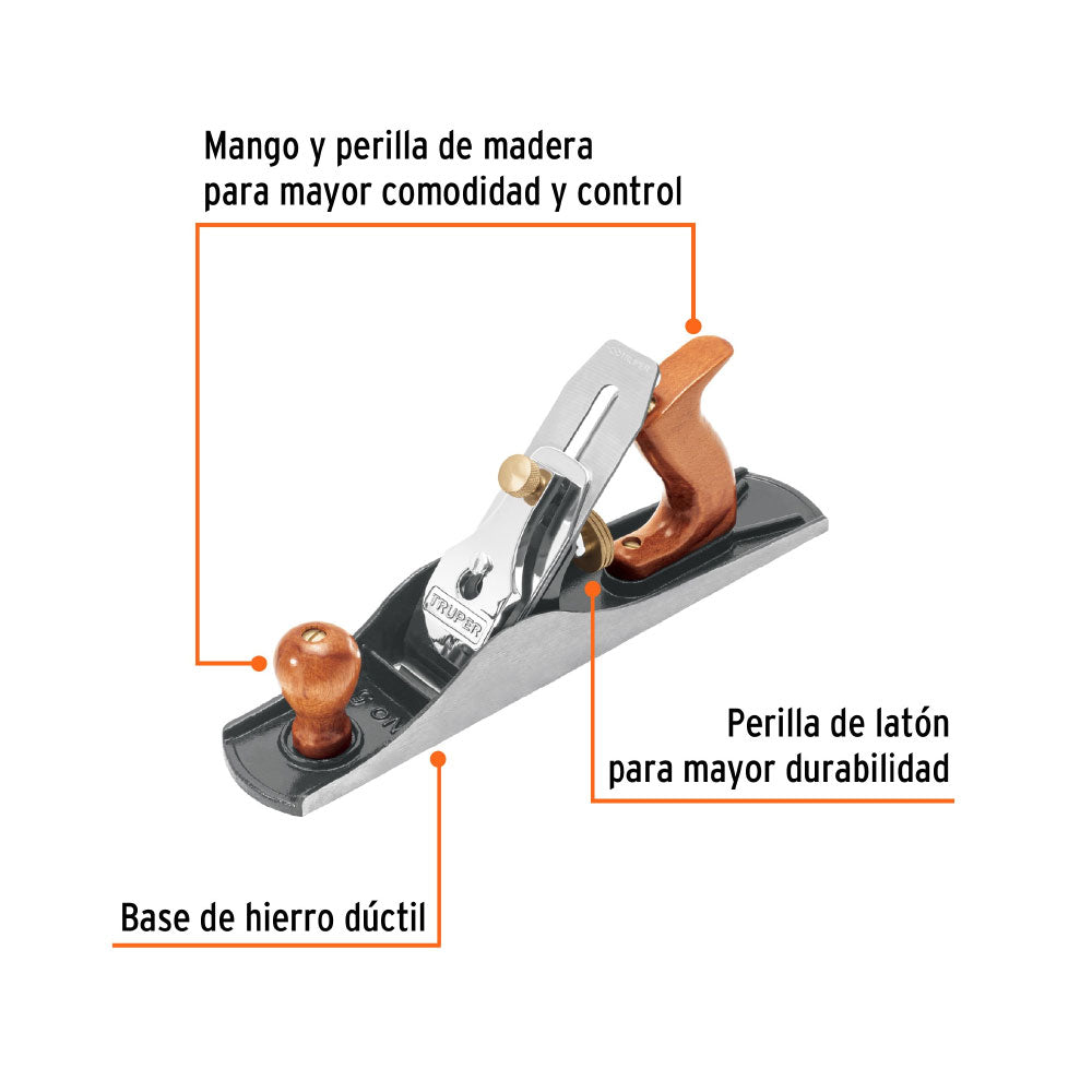 Es una herramienta indispensable para los profesionales y aficionados de la madera. Este cepillo tiene un cuerpo fundido de hierro nodular para un alto desempeño y una base de hierro dúctil que garantiza una superficie lisa y uniforme.Especificaciones