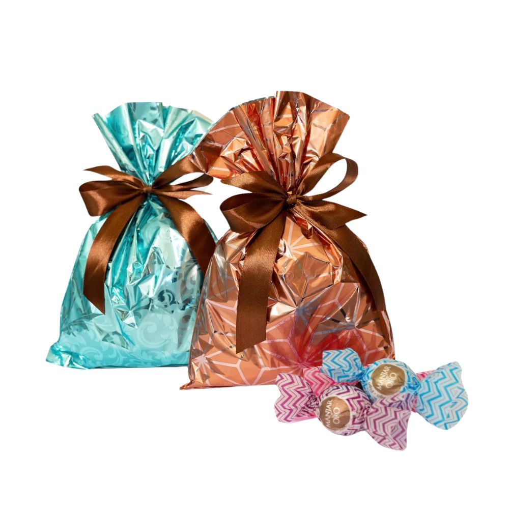 - Presentación: Bolsa de plástico dorado con moño rojo