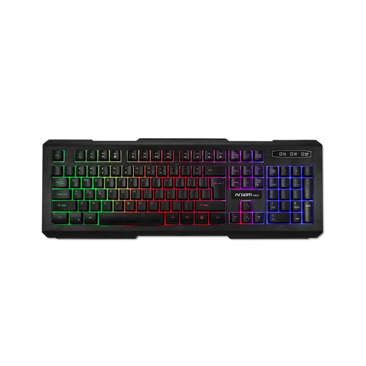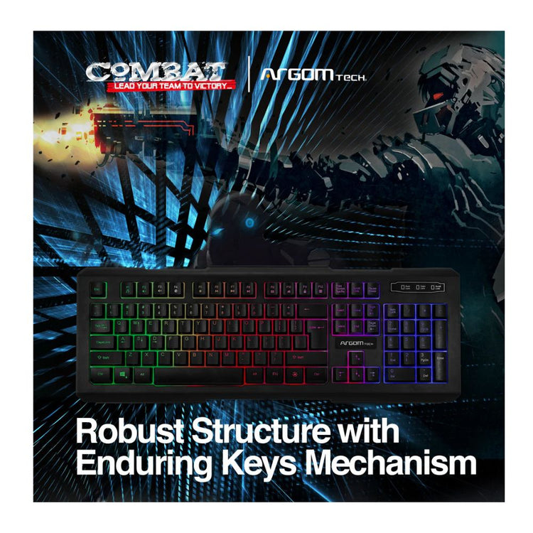 Como parte de nuestra colección de juegos, el teclado para juegos de combate es todo lo que necesitas para mejorar tu juego. Recarga, apunta y dispara con este teclado para juegos especialmente diseñado que tiene una construcción robusta y todos los silbidos y golpes que necesitas para vencer a tu oponente. Juega en la oscuridad con sus luces de arcoíris, teclas iluminadas y estilo elegante, que definitivamente mejorarán tu campo de batalla.