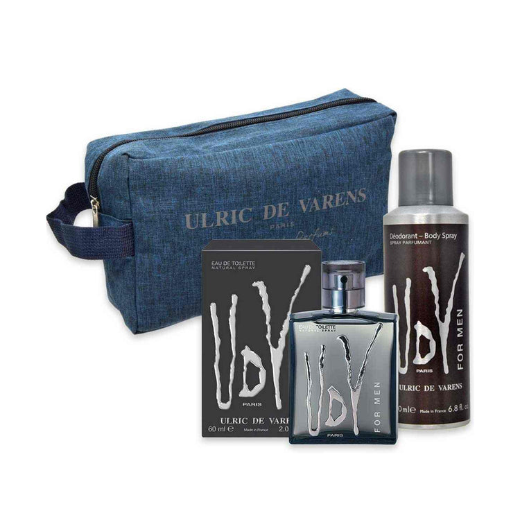 El estuche UDV For Men es un conjunto de perfume y desodorante-body spray que incluye un perfume de 100ml y un desodorante-body spray de 200ml, acompañado de un neceser para transportar y almacenar tus productos de higiene personal de manera organizada y elegante.
