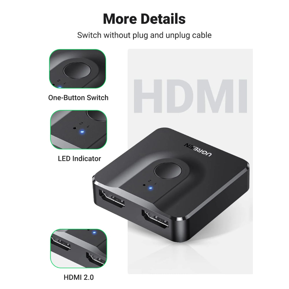• Diseño bidireccional: Funciona tanto como conmutador (2 entradas HDMI a 1 salida) como divisor (1 entrada HDMI a 2 salidas), permitiendo flexibilidad en la configuración de tus dispositivos.