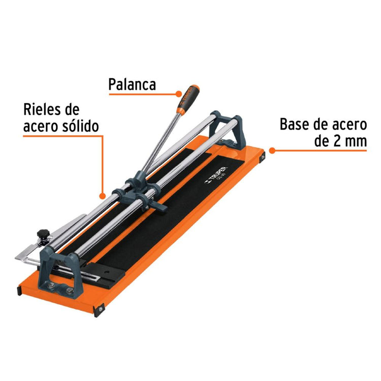 Esta diseñado con una base robusta y una cuchilla de corte afilada que permite cortar los azulejos con facilidad y precisión. Este cortador de azulejos tiene una longitud de corte de alrededor de 61 cm, lo que le permite manejar azulejos de diferentes tamaños y grosor. Además, esta equipado con un sistema de guía y una rueda de corte que facilita el trazado y la realización del corte de manera recta y uniforme.