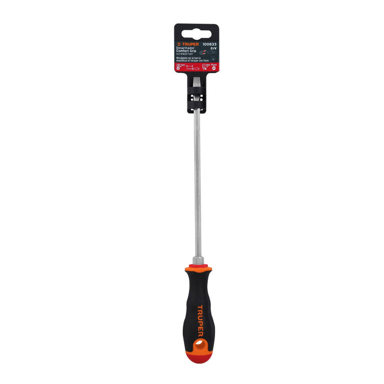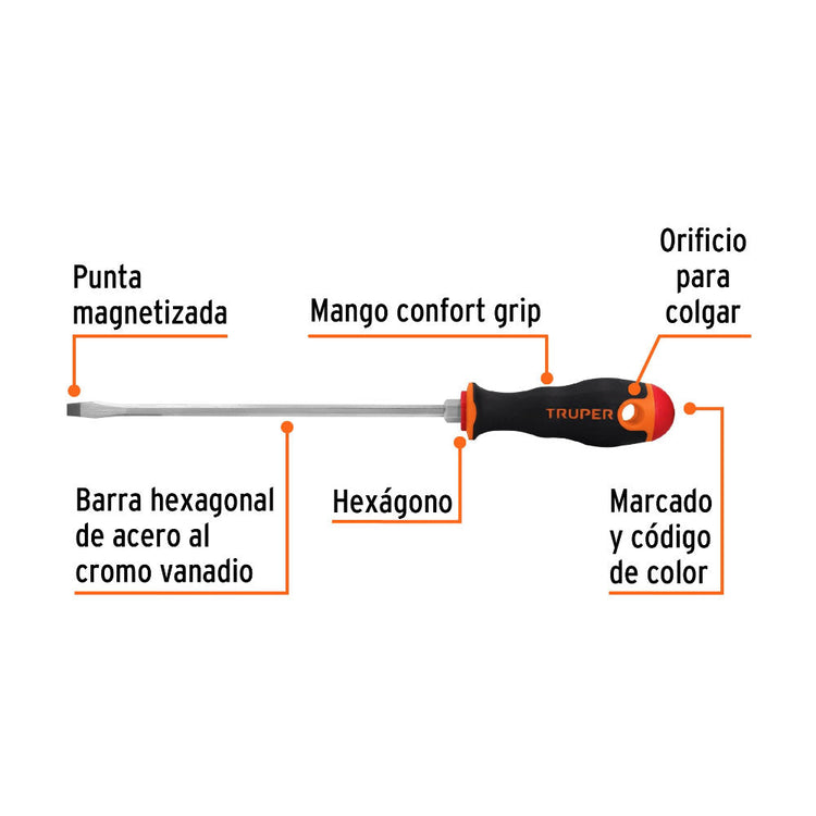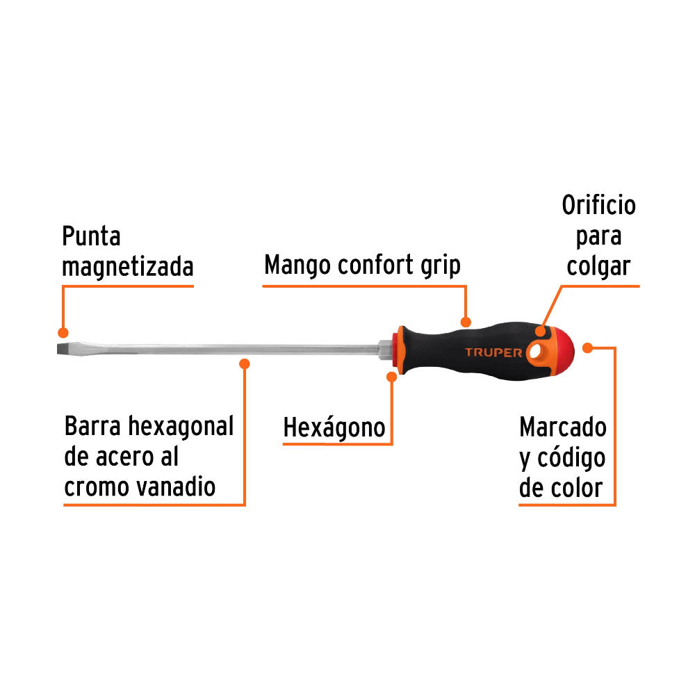 Este desarmador plano de Truper es una herramienta esencial para cualquier caja de herramientas. Con una punta plana de 1/4 de pulgada y una longitud de 8 pulgadas, este desarmador es ideal para una variedad de aplicaciones de bricolaje, desde apretar tornillos hasta trabajar en proyectos de carpintería.
