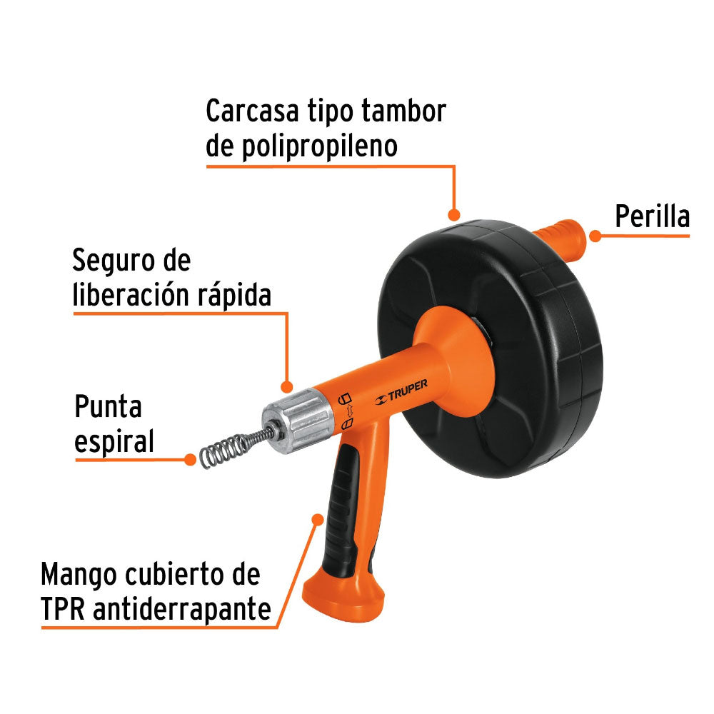 Esta herramienta de alta calidad está fabricada con un alma de acero resistente que garantiza una máxima durabilidad y rendimiento, incluso en las obstrucciones más difíciles. Guía de acero al carbono con embobinado compacto en tambor, que evita deformaciones por torsión y facilita el desplazamiento, Los destapa caños Truper son de alta calidad y durabilidad.