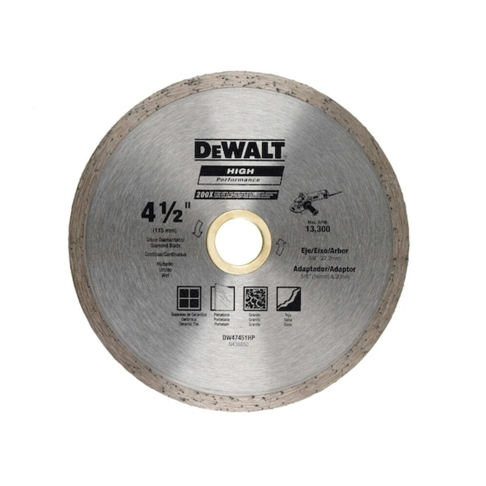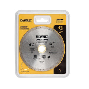 El Disco Diamantado Continuo DeWalt de 4-1/2" (115mm) es la herramienta ideal para cortes precisos y suaves en materiales como baldosas de cerámica, granito, porcelana y tejas. Fabricado con diamante industrial de alta calidad, este disco ofrece una durabilidad excepcional y un rendimiento superior. Su borde continuo garantiza un corte limpio y sin astillas, ideal para trabajos que requieren un acabado profesional. Con una velocidad máxima de 13,300 RPM y un eje adaptable de 7/8" (22.23 mm) con adaptadores de 5/8" (16 mm) y 20 mm, este disco es versátil y compatible con diversas máquinas de corte. Perfecto para aplicaciones en seco o húmedo, el Disco Diamantado Continuo DeWalt de 4-1/2" es la elección perfecta para profesionales que buscan precisión y calidad en sus proyectos.