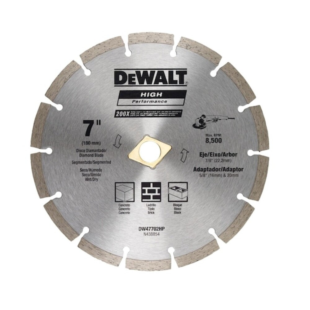 El Disco Diamantado Segmentado DeWalt de 7" (180mm) es la herramienta ideal para cortes rápidos y precisos en concreto, piedra y bloques. Diseñado con segmentos de diamante soldados por rayo láser, este disco ofrece una durabilidad excepcional y un rendimiento superior. Su placa de acero tratada a calor garantiza máxima fortaleza y resistencia a altas temperaturas, asegurando una larga vida útil y cortes profundos sin deformaciones. Con una velocidad máxima de 5,500 RPM y un eje adaptable de 7/8" (22.23 mm) con adaptadores de 5/8" (16 mm) y 20 mm, este disco es versátil y compatible con diversas máquinas de corte. Ideal para aplicaciones en seco o húmedo, el Disco Diamantado Segmentado DeWalt de 7" es la elección perfecta para profesionales que buscan calidad y eficiencia en sus proyectos.