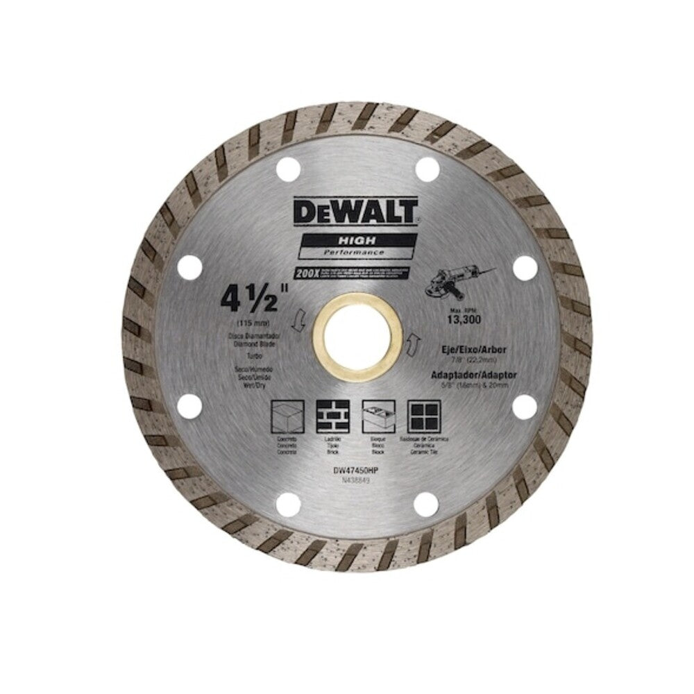 El Disco Diamantado Turbo DeWalt de 4-1/2" (115mm) es la herramienta ideal para cortes rápidos y precisos en concreto, ladrillo, bloques y baldosas de cerámica. Fabricado con diamante industrial y un avanzado sistema de banda diamantada, este disco ofrece un rendimiento óptimo y una durabilidad excepcional. Su diseño turbo permite una rápida remoción de material y proporciona un acabado limpio y profesional en cada corte. Con una velocidad máxima de 13,300 RPM y un eje adaptable de 7/8" (22.23 mm) con adaptadores de 5/8" (16 mm) y 20 mm, este disco es versátil y compatible con diversas máquinas de corte. Ideal para aplicaciones en seco o húmedo, el Disco Diamantado Turbo DeWalt de 4-1/2" es la elección perfecta para profesionales que buscan eficiencia y calidad en sus proyectos.