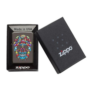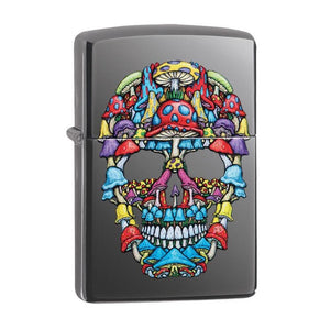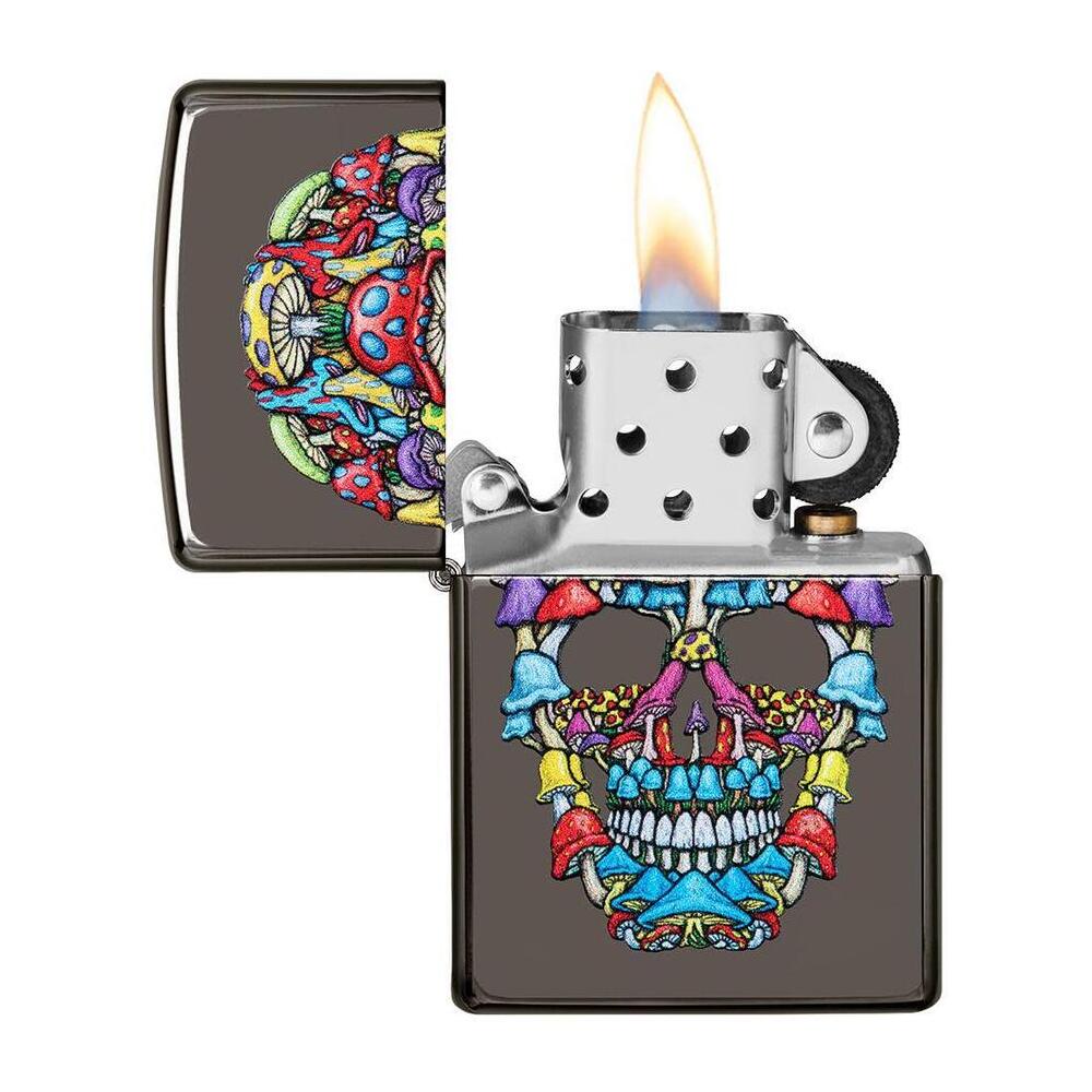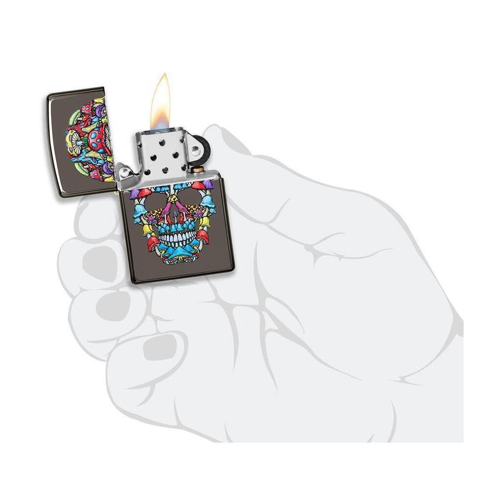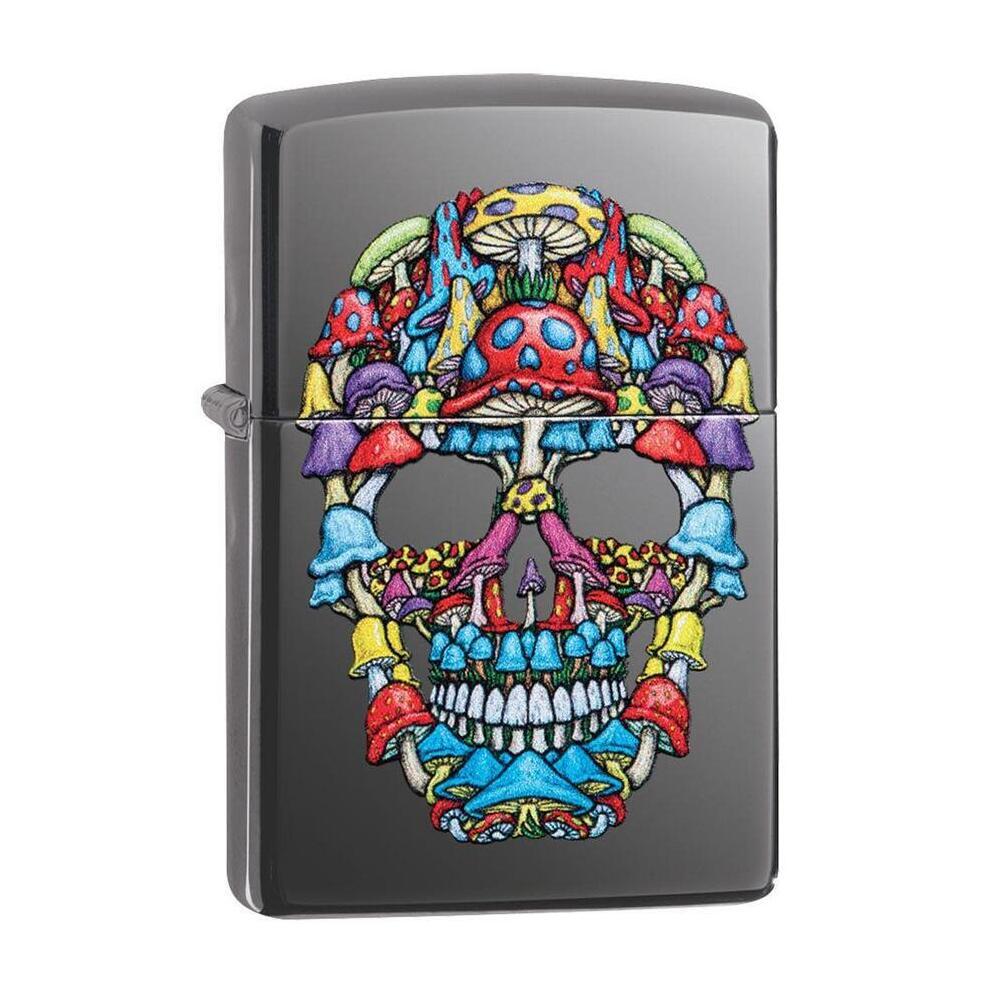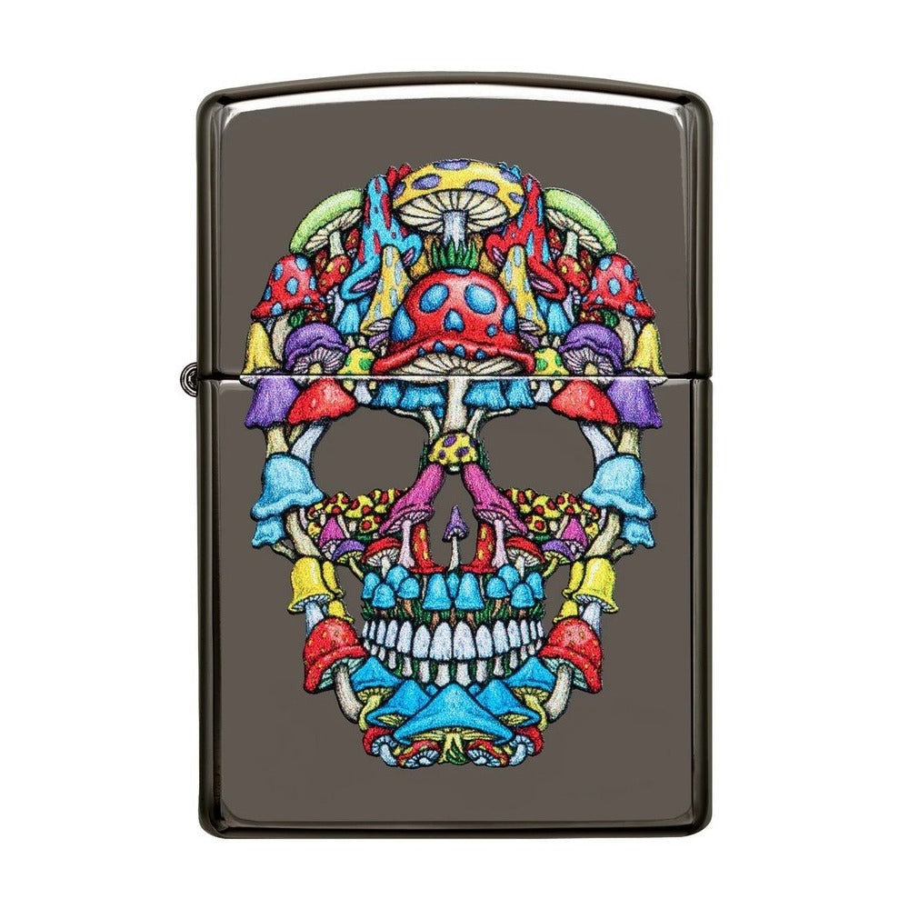Utilizando imágenes en color, crea una calavera alucinante formada por una tropa de hongos multicolores sobre un fondo negro. El acabado Black Ice le da un toque misterioso y atractivo. Ideal para los amantes de lo macabro y lo original. ¡Llévalo contigo y enciende tus momentos con estilo!, viene empaquetado en una caja de regalo. Para un rendimiento óptimo, llénelo con combustible para encendedor Zippo.
