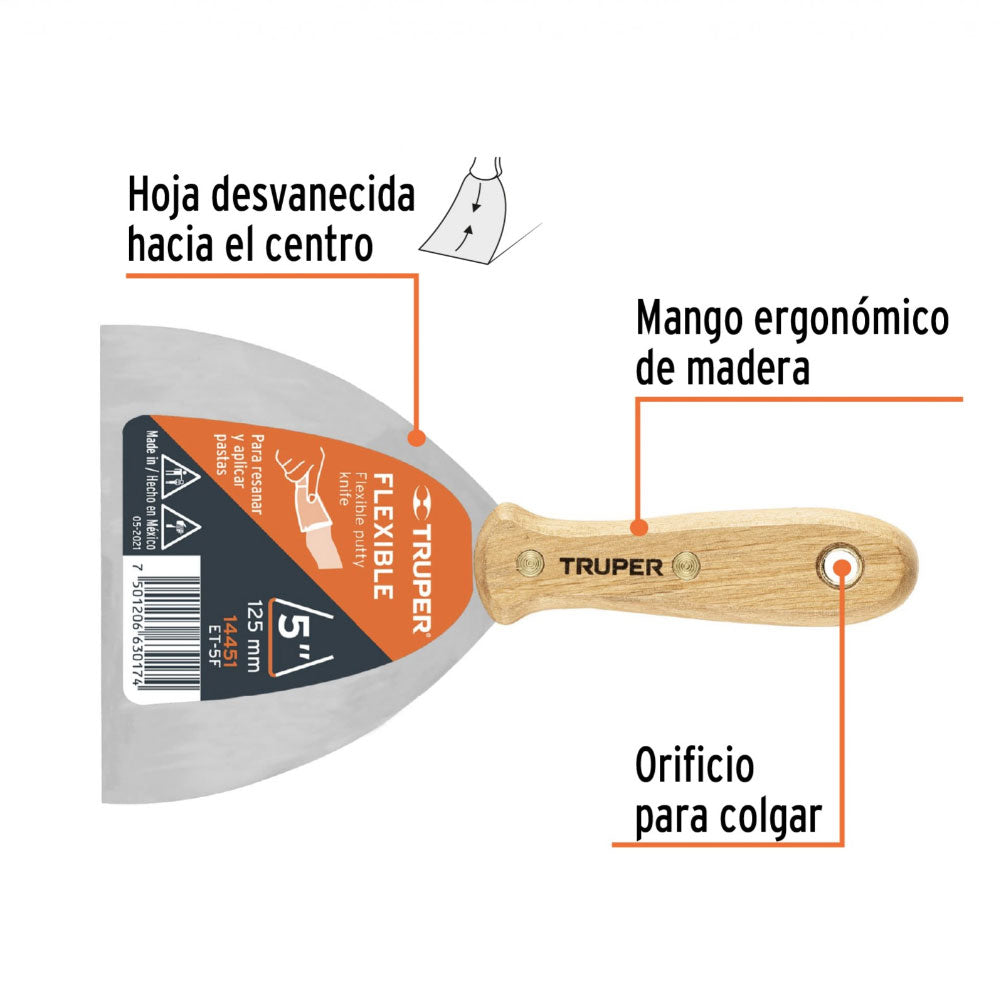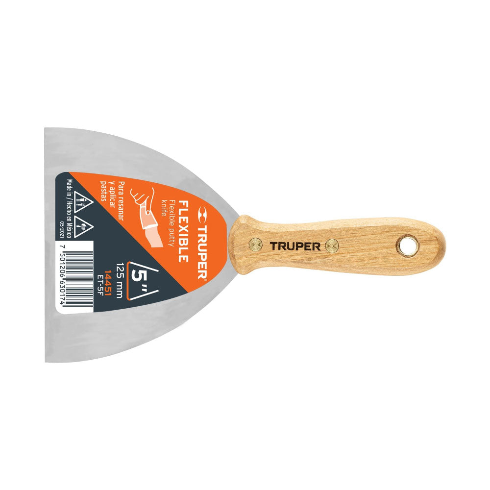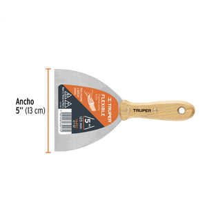 La espátula flexible de 5" mango de madera es un producto que te permite realizar diversas tareas de construcción y remodelación con facilidad y calidad. Tiene un ancho de 5" (13 cm), que la hace adecuada para resanar grietas, aplicar pastas y raspar superficies planas