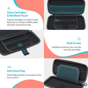 • Está diseñado para ofrecer una protección completa y portabilidad al Nintendo Switch. Fabricado con materiales de alta calidad, como EVA y tela Oxford 1680D, garantiza seguridad contra golpes y caídas. Su diseño compacto y funcional permite transportar la consola y sus accesorios de manera ordenada y accesible.