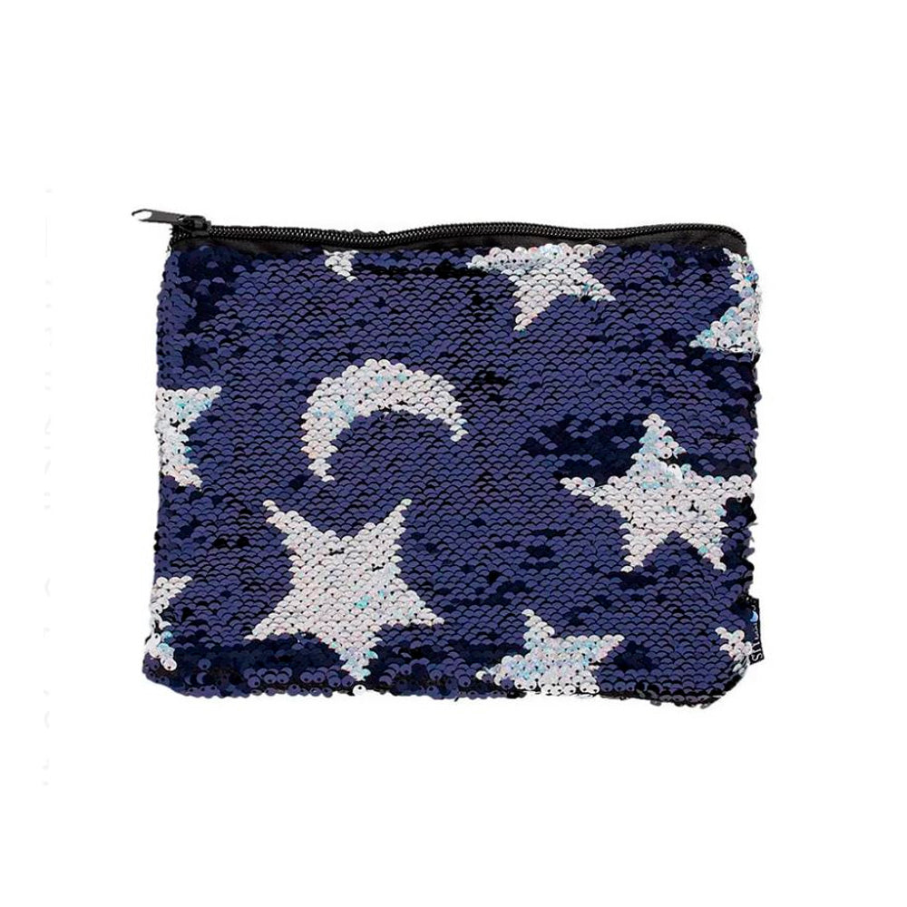 Este estuche cuenta con estrellas celestes y lunas que cambian de blanco a plata sobre lentejuelas azules oscuras con un simple toque de la mano.