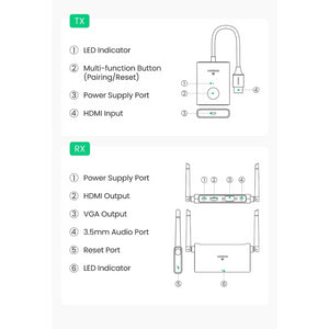• Es un extensor HDMI inalámbrico que permite transmitir señales de video y audio desde dispositivos de entrada HDMI, como reproductores de video y computadoras, a dispositivos de salida HDMI, como monitores y proyectores, sin necesidad de cables físicos. Esto simplifica la instalación y reduce el desorden de cables en su espacio.