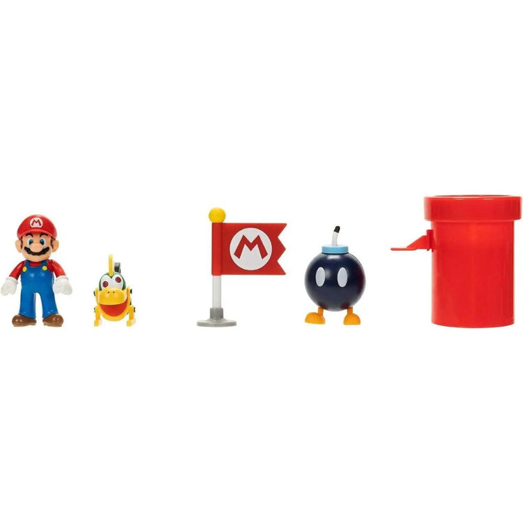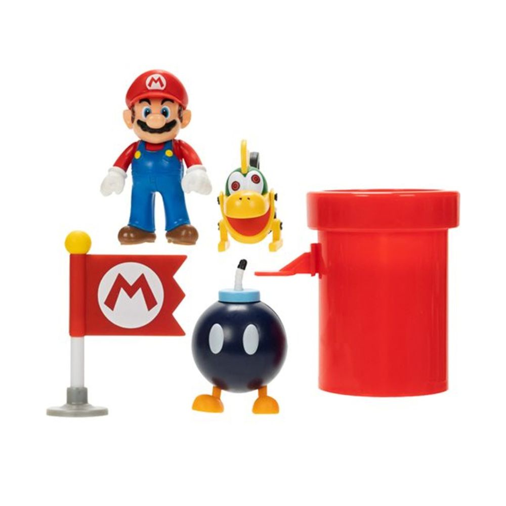 Incluye Mario, Mechakoopa, Bob-omb de 2,5 pulgadas, tubo de urdimbre rojo y bandera de punto de control de doble cara. Los accesorios son modulares y también se pueden utilizar con los juegos.
