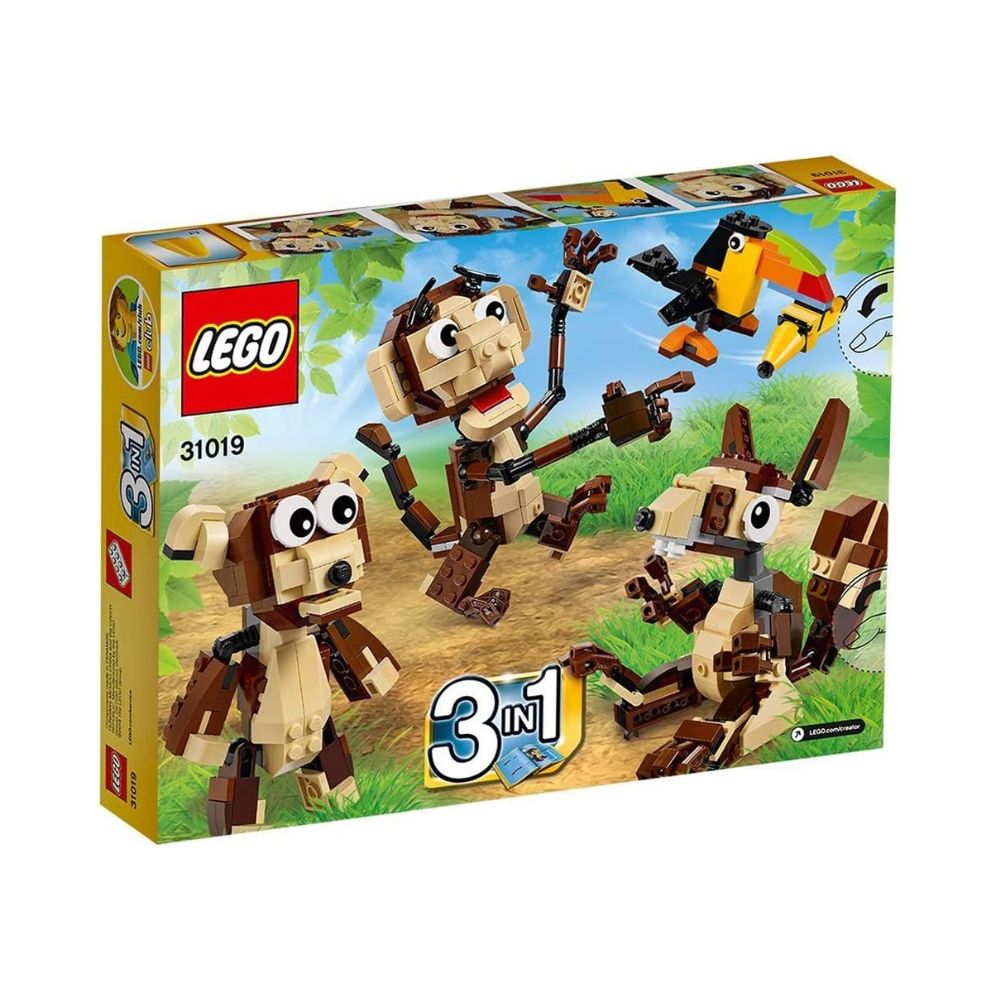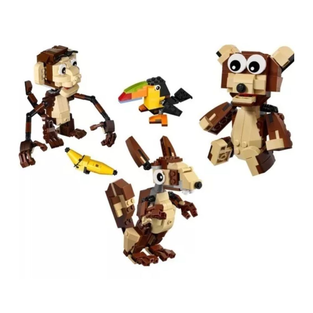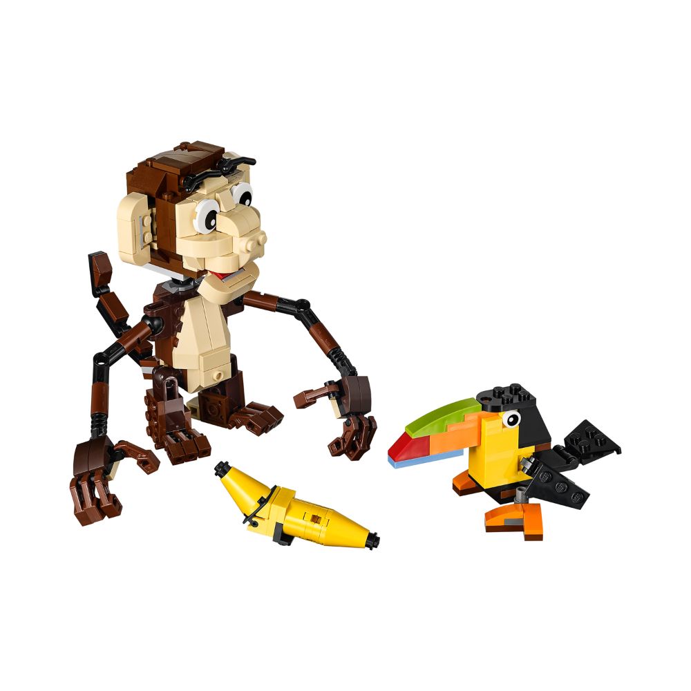 Coloca sus brazos, piernas y cola en todo tipo de posiciones y ajusta sus ojos, cejas y boca abierta para cambiar su expresión. Toma un sabroso plátano y juega junto con el colorido tucán. Luego reconstruye el mono del bosque y conviértelo en una selección de 2 nuevos y locos modelos: ¡un osito de peluche súper lindo o una ardilla muy traviesa!