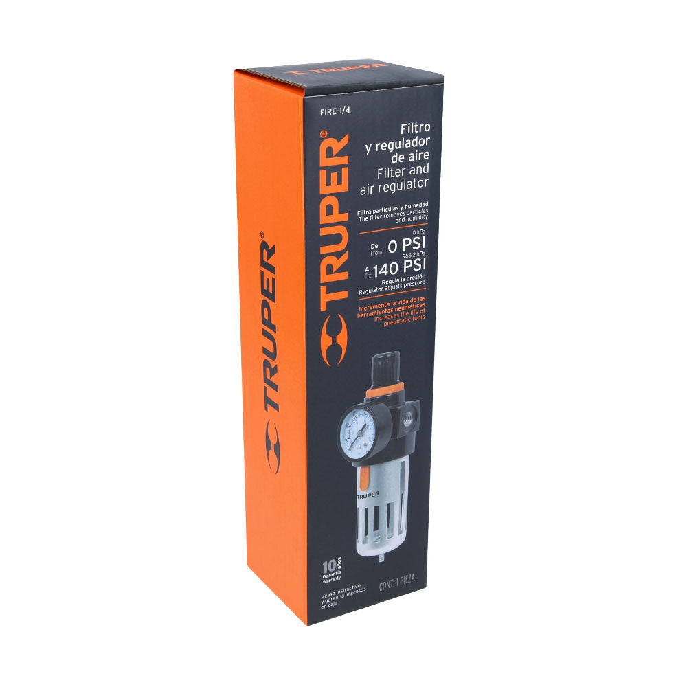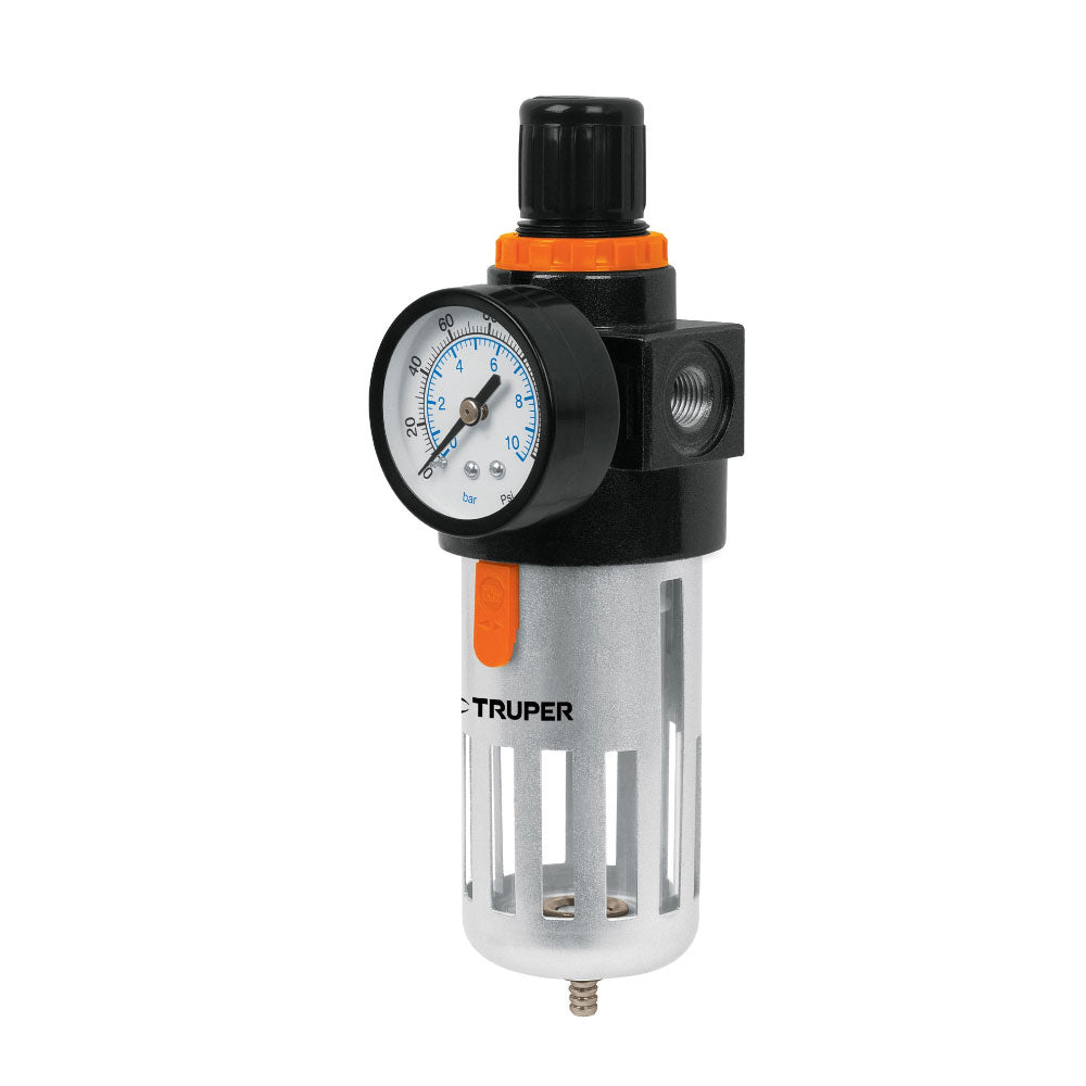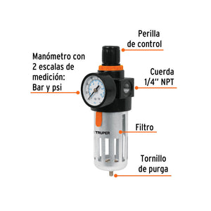 El Filtro Regulador de Aire Truper de 1/4" NPT es la solución ideal para mantener tus herramientas neumáticas funcionando de manera óptima. Diseñado para proporcionar un suministro de aire limpio, regulado y libre de humedad, este filtro regulador ofrece un control preciso sobre la presión del aire, mientras protege tus herramientas de los daños causados por la contaminación y la corrosión.