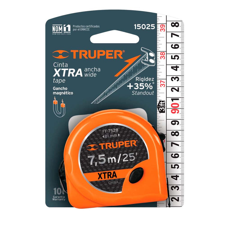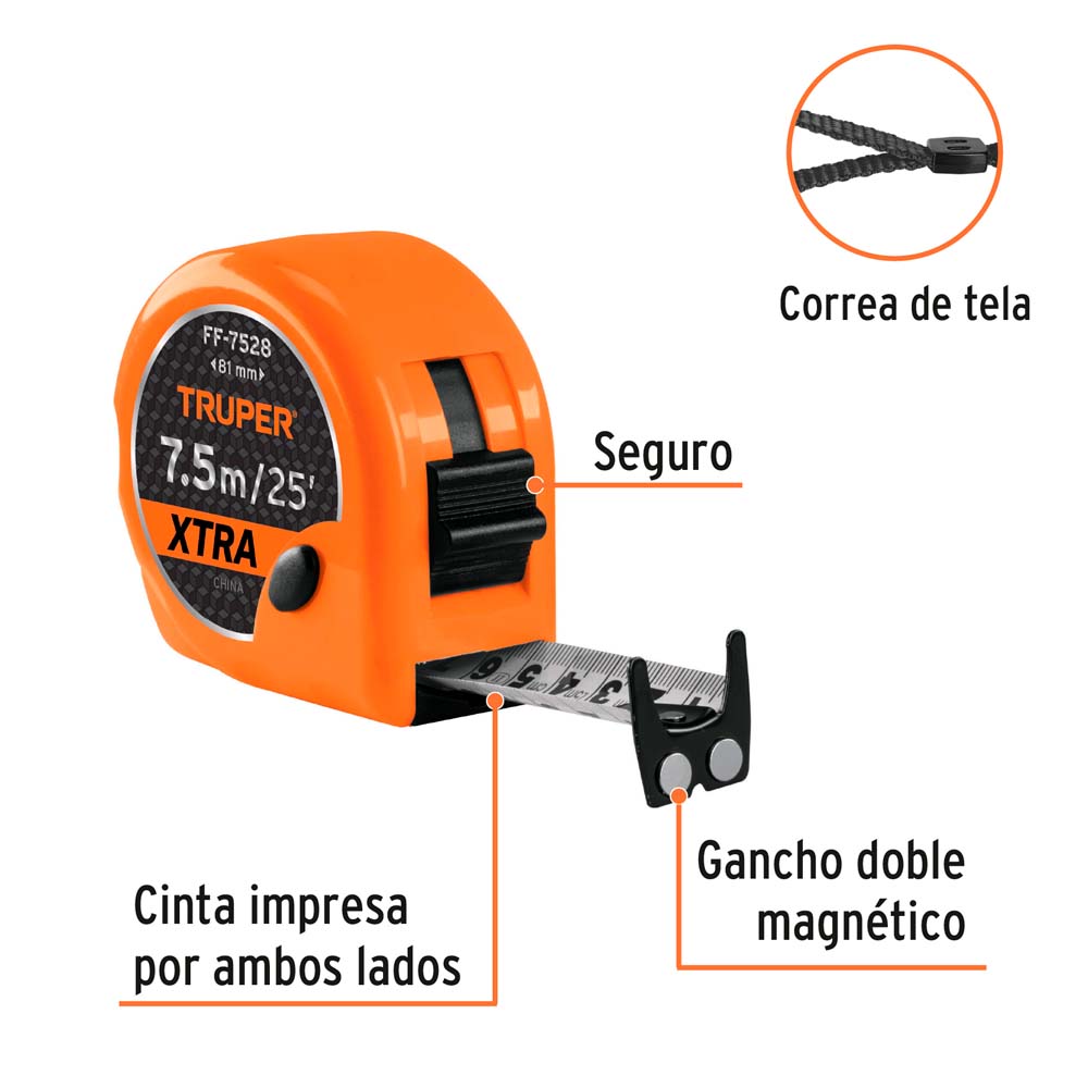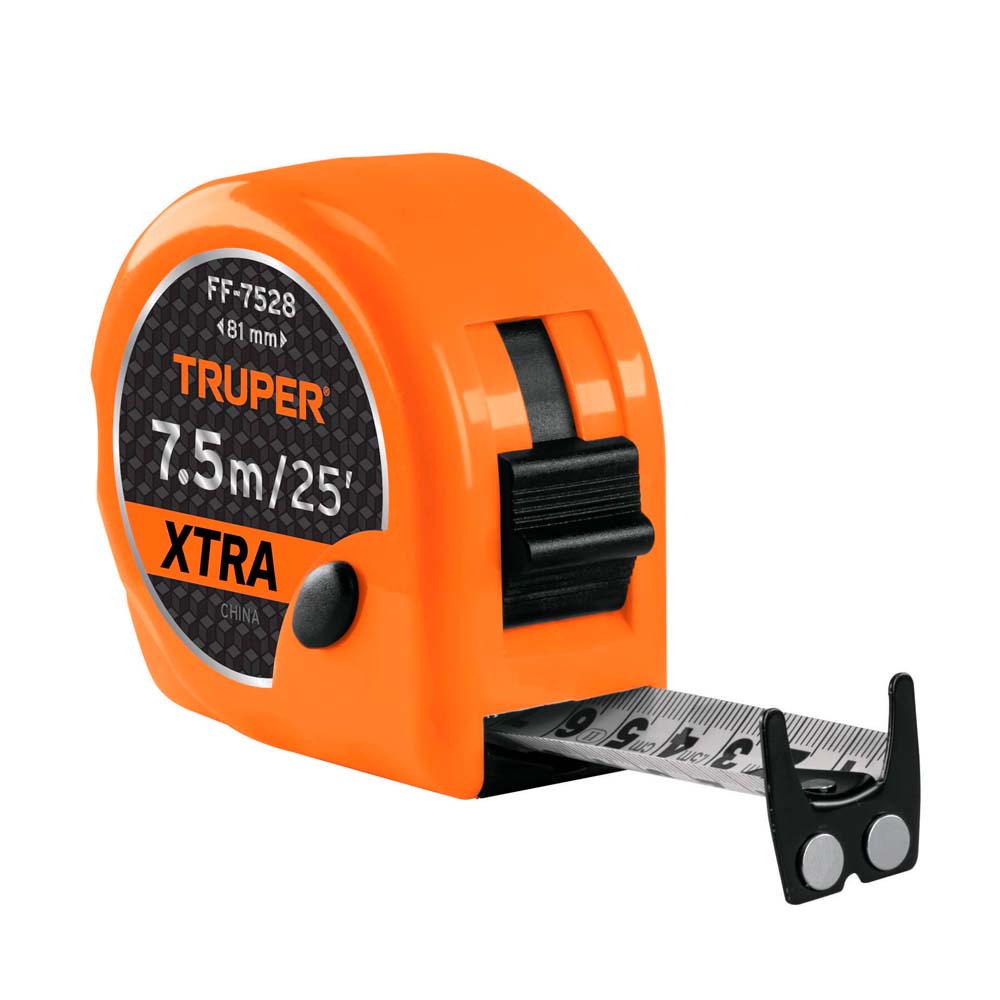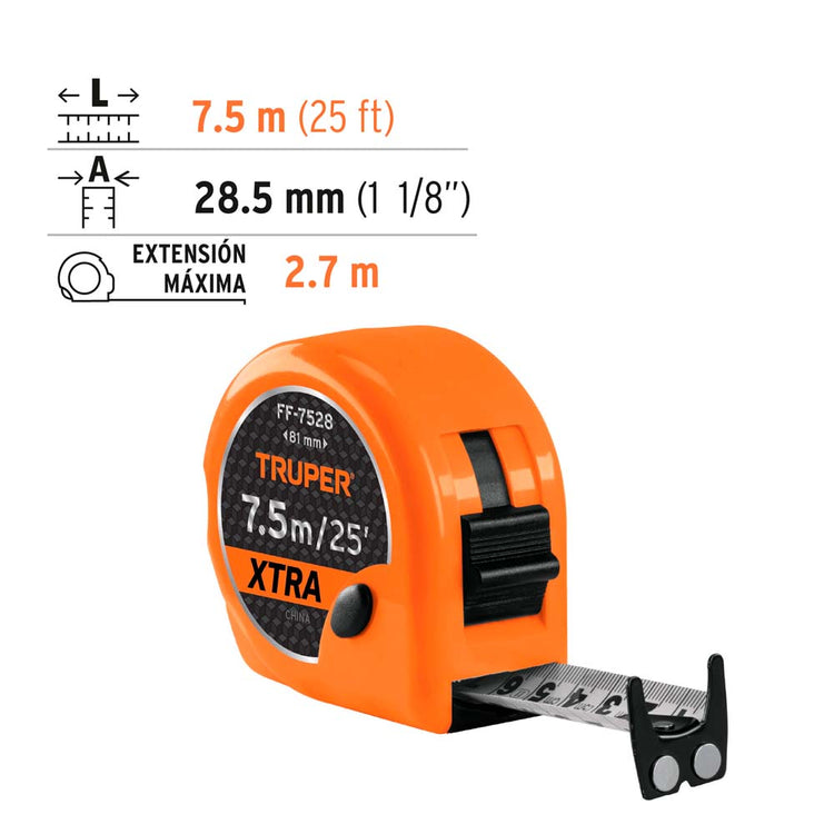 Este flexómetro de Truper, es una herramienta versátil y robusta para medir con precisión distancias de hasta 7.5 metros. Fabricada con materiales de alta calidad para garantizar una larga vida útil. cuenta con freno frontal y lateral para mayor control de cinta.