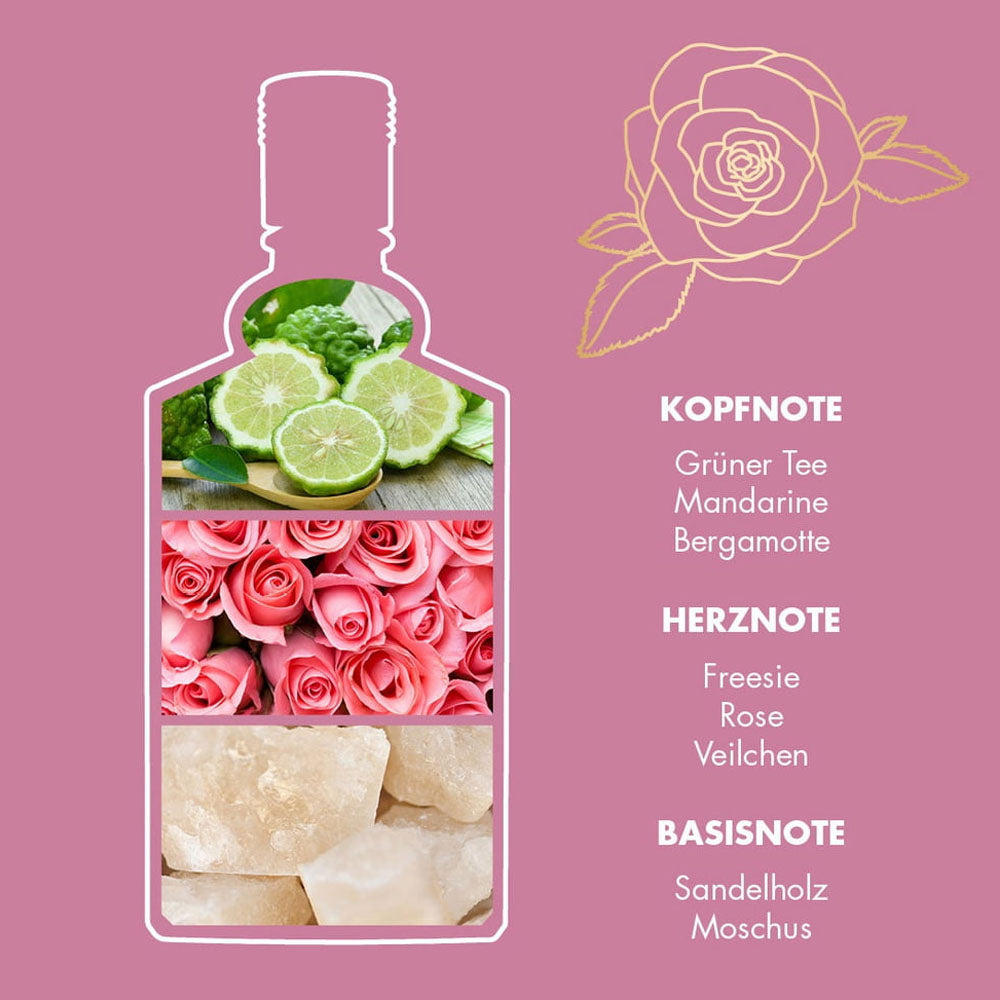 - Notas de corazón: Rosa, aportando un toque floral y dulce.