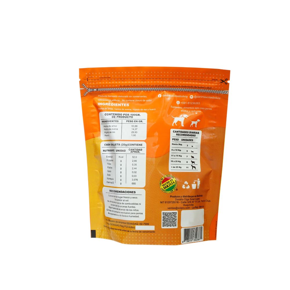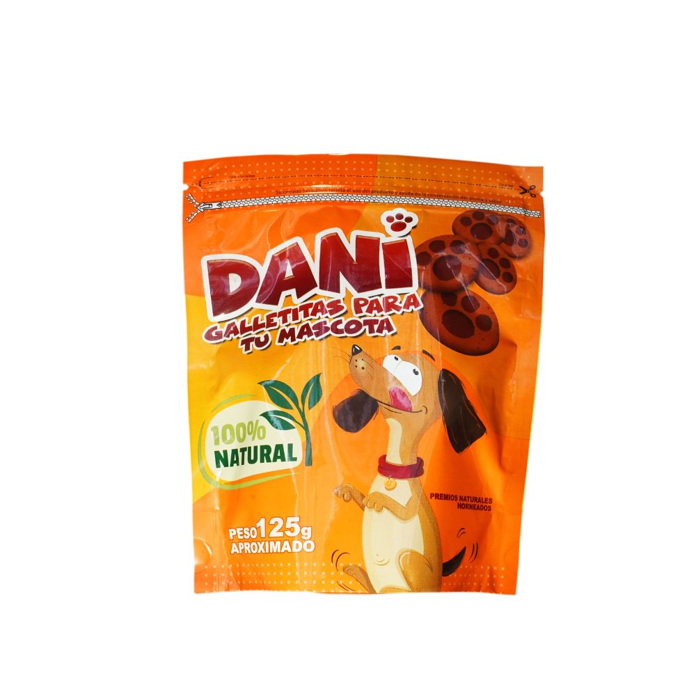 Premia a tu mascota con lo mejor. Sorprende a tu perrito con un premio delicioso y saludable. DANI elabora galletitas con ingredientes 100% naturales, frescos y ricos en proteínas de origen animal, combinados con cereales libres de gluten. Son perfectas para cualquier raza, ya que están diseñadas pensando en el bienestar y la nutrición de tu peludo, respaldado con los registros sanitarios necesarios.