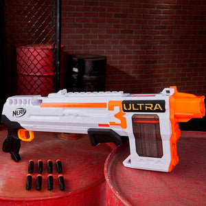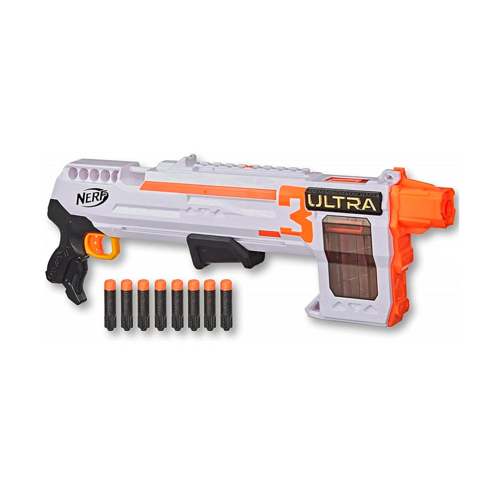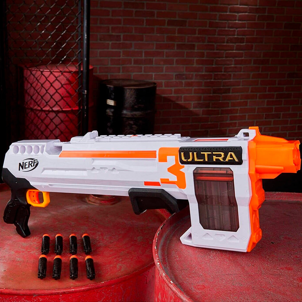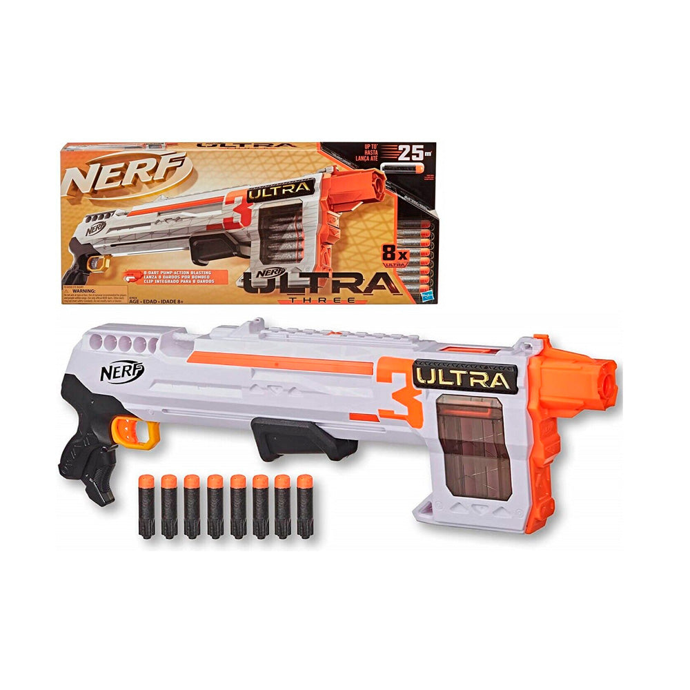 El lanzador Nerf Ultra Three cuenta con voladura de acción de bomba y un clip interno de 8 dardos.