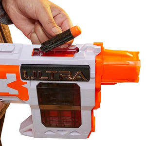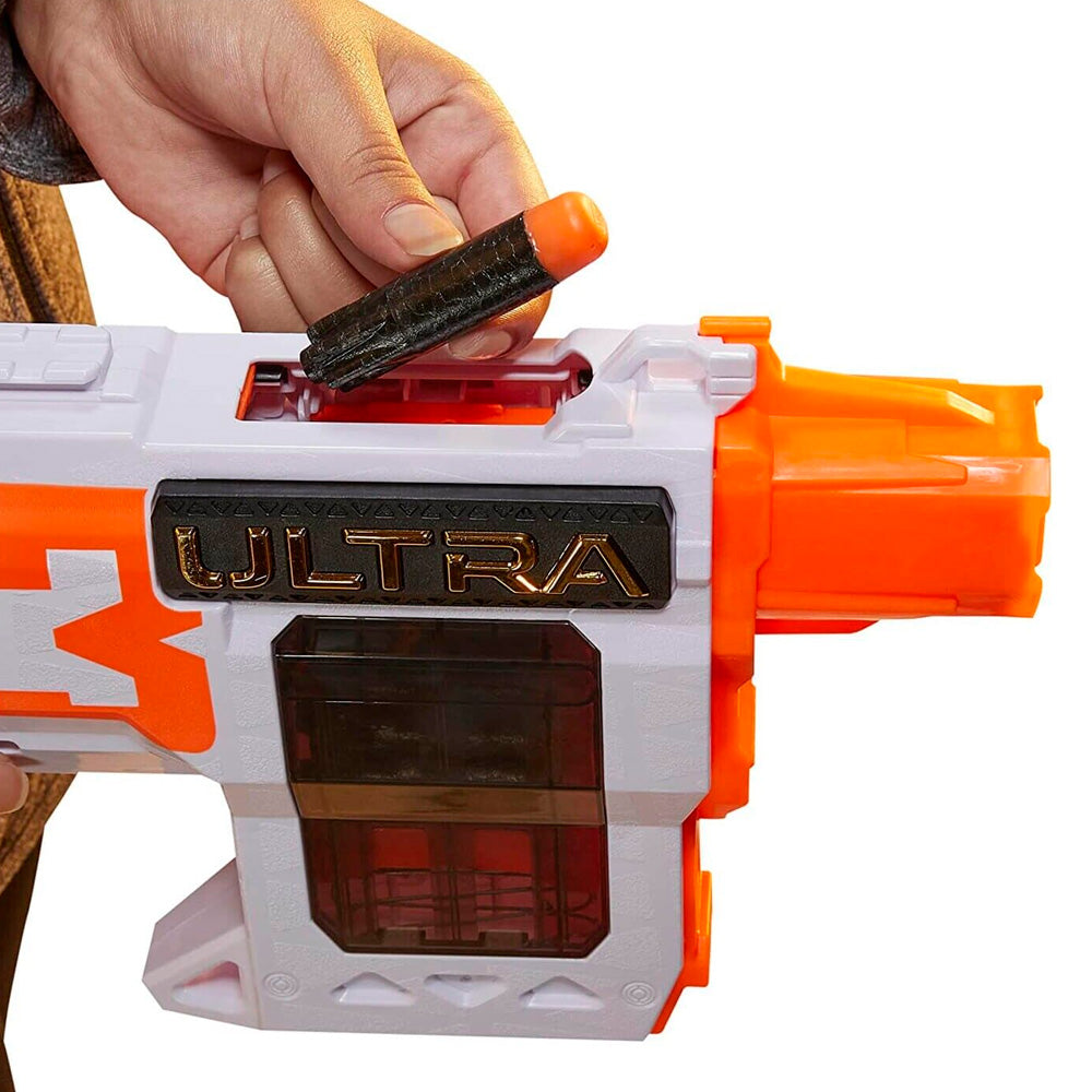 Demuestre sus habilidades para disparar dardos mientras bombea el mango de cebado y presiona el gatillo para disparar 8 dardos seguidos antes de que sea el momento de recargar. Almacenamiento a bordo para 4 dardos (los dardos adicionales se venden por separado). Incluye 8 dardos Nerf Ultra que son compatibles solo con blasters Nerf Ultra.