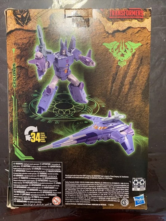 - Incluye figura Cyclonus Transformers Generations War for Cybertron: Kingdom clase viajero, accesorio, tarjeta de disco dorado e instrucciones.