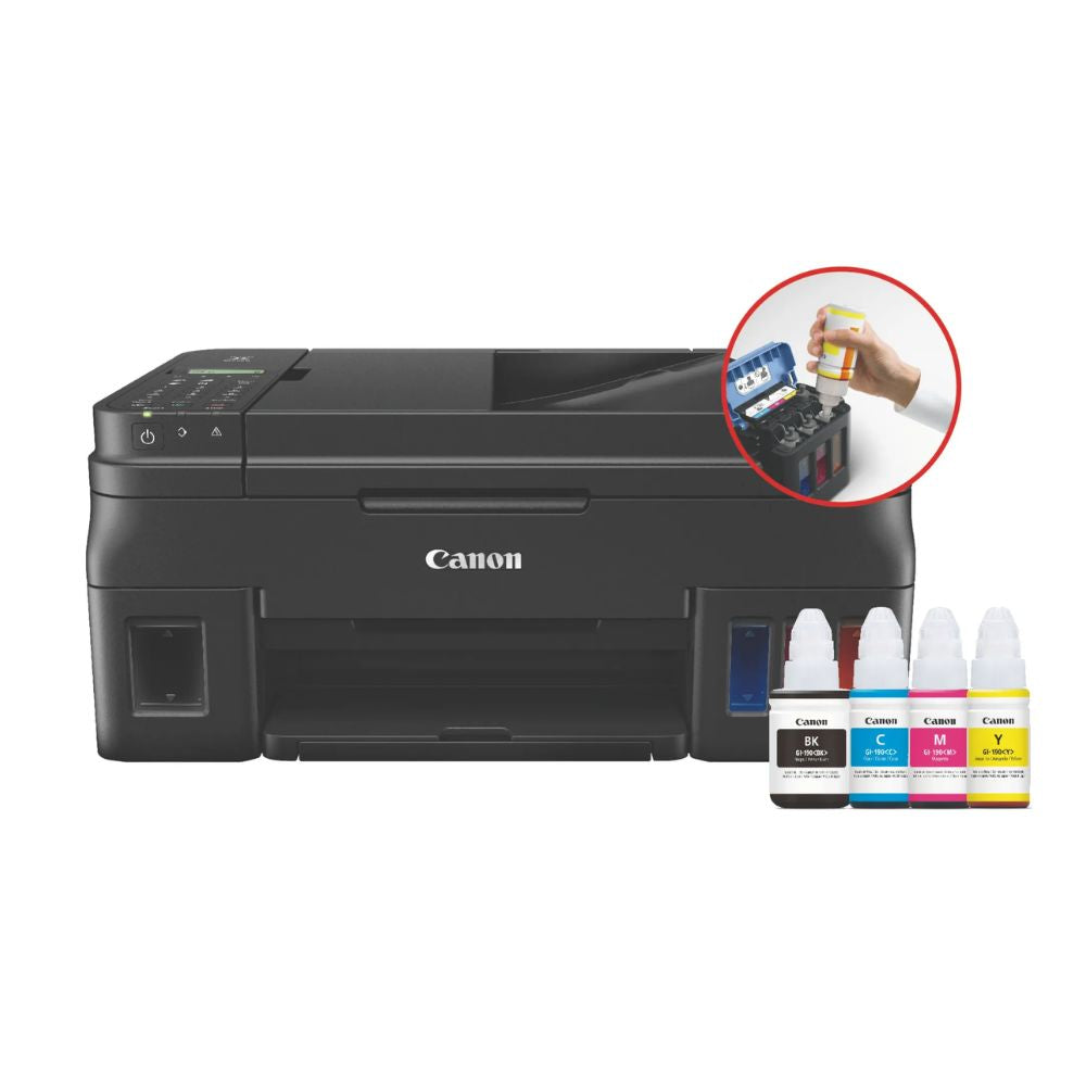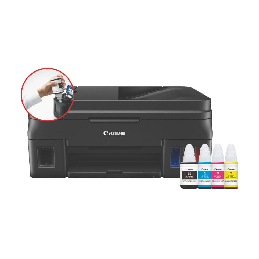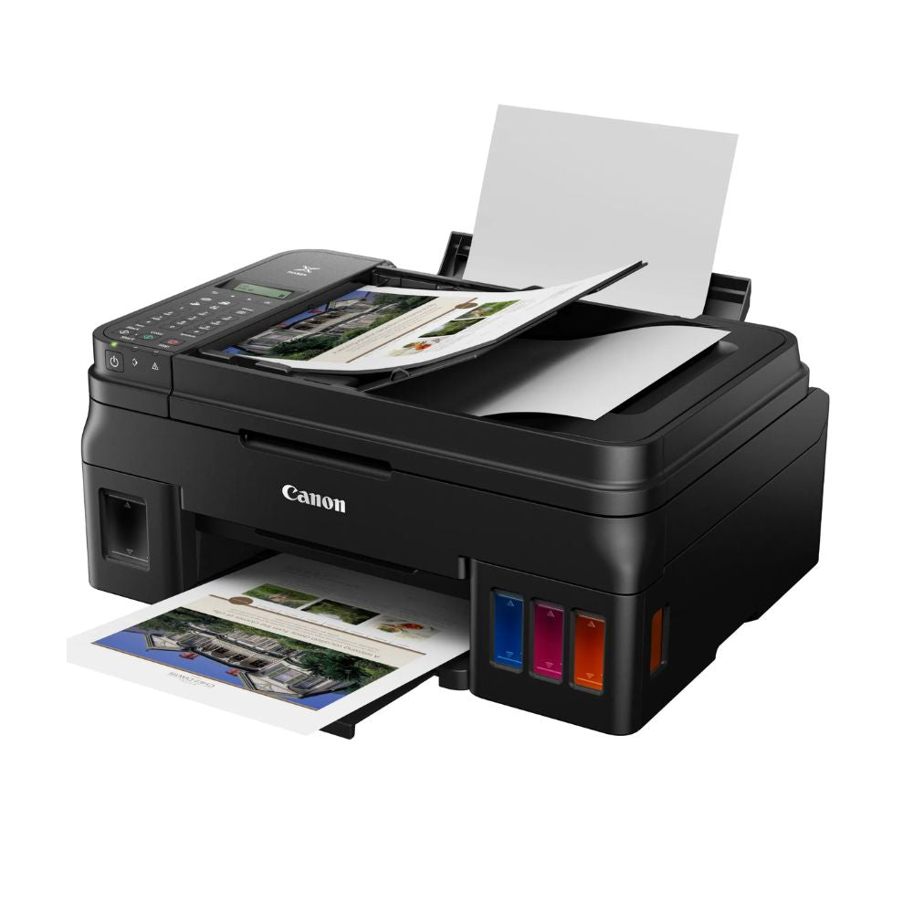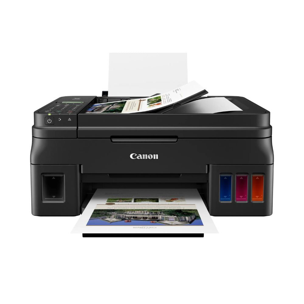 La Canon PIXMA G4110 es una impresora multifuncional inalámbrica que ofrece impresión, copiado, escaneo y envío de fax en un solo dispositivo. Equipada con un sistema de tinta híbrido y tanques integrados de fácil recarga, garantiza textos nítidos y colores vibrantes. Su diseño compacto incorpora un alimentador automático de documentos de 20 hojas y una pantalla LCD de 2 líneas, facilitando su uso. Ideal para quienes buscan eficiencia y calidad, la PIXMA G4110 es perfecta para optimizar procesos en oficinas y hogares.