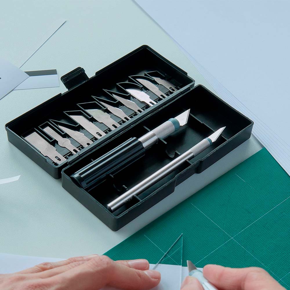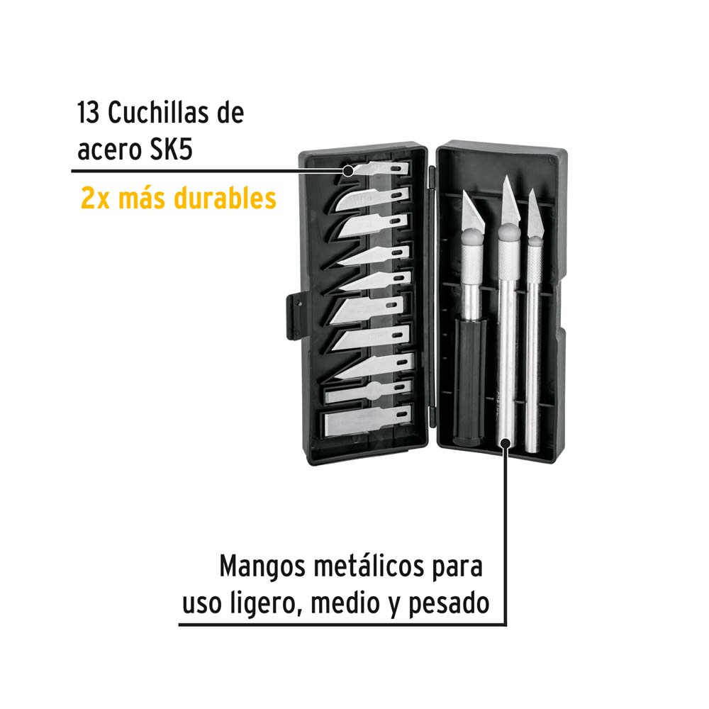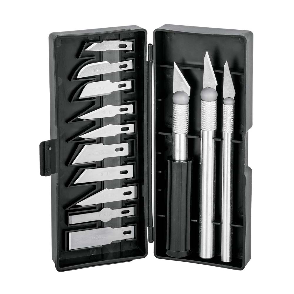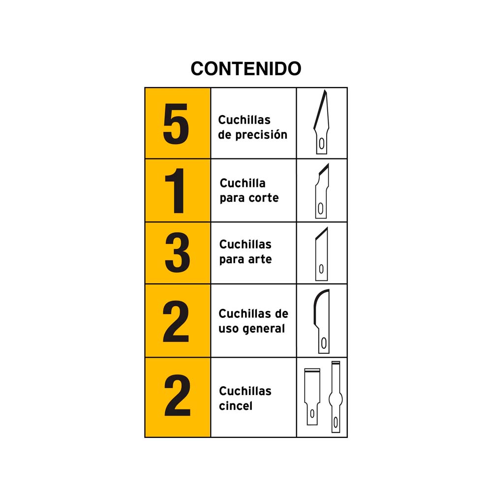 Este completo set es la herramienta perfecta para cualquier entusiasta del bricolaje, modelismo, artesanía o cualquier tarea que requiera precisión. 13 piezas de alta calidad, este juego ofrece una amplia variedad de opciones para cortar, tallar, raspar y realizar trabajos delicados con precisión milimétrica. Las cuchillas de acero templado garantizan un corte limpio y preciso en una variedad de materiales, desde papel y cartón hasta madera y plástico.