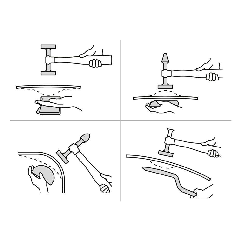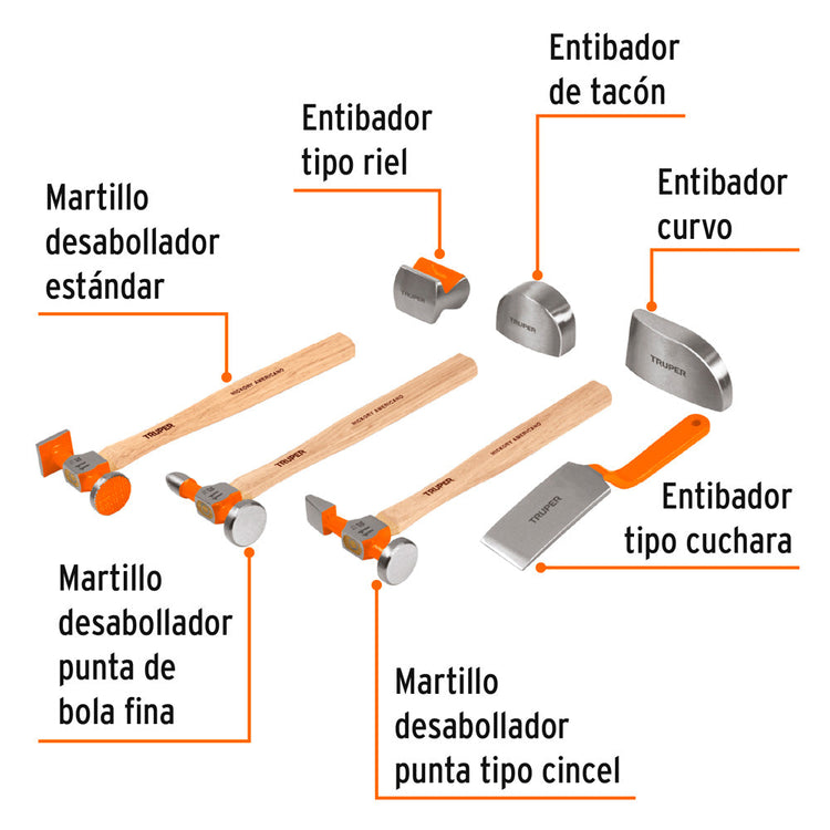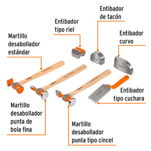 - Incluye: Estuche plástico, 1 Martillo desabollador fino, 11 oz, 1 Martillo desabollador punta tipo cincel 11 oz, 1 Martillo desabollador estándar 11 oz, 1 Entibador curvo 43 oz, 1 Entibador de tacón 38 oz, 1 Entibador tipo riel 26 oz, 1 Entibador tipo cuchara 18 oz