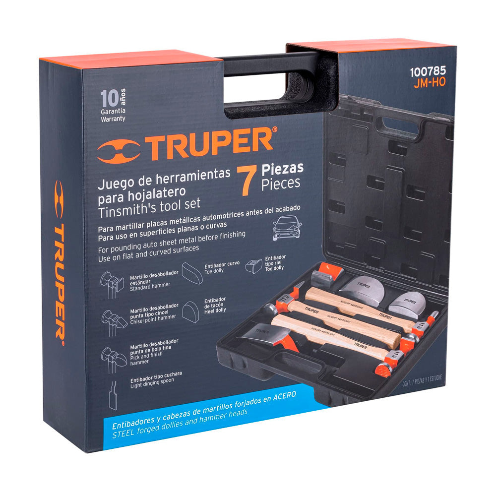El Juego 7 piezas Truper de martillos y entibadores para hojalatero es un conjunto de herramientas diseñadas para facilitar el trabajo de reparación y restauración de superficies metálicas. Incluye un estuche plástico para guardar y transportar las herramientas con facilidad.