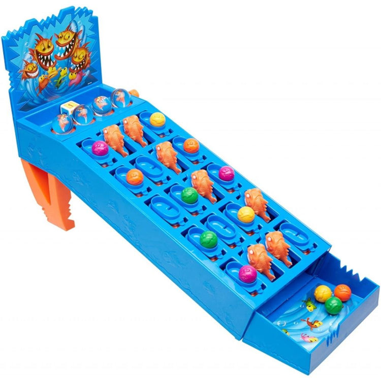 Para ganar, los jugadores deben ser los primeros en conseguir que sus tres canicas de peces lleguen a la parte superior de la “corriente”, pero deben tener cuidado, porque las pirañas pueden atacar a los peces.