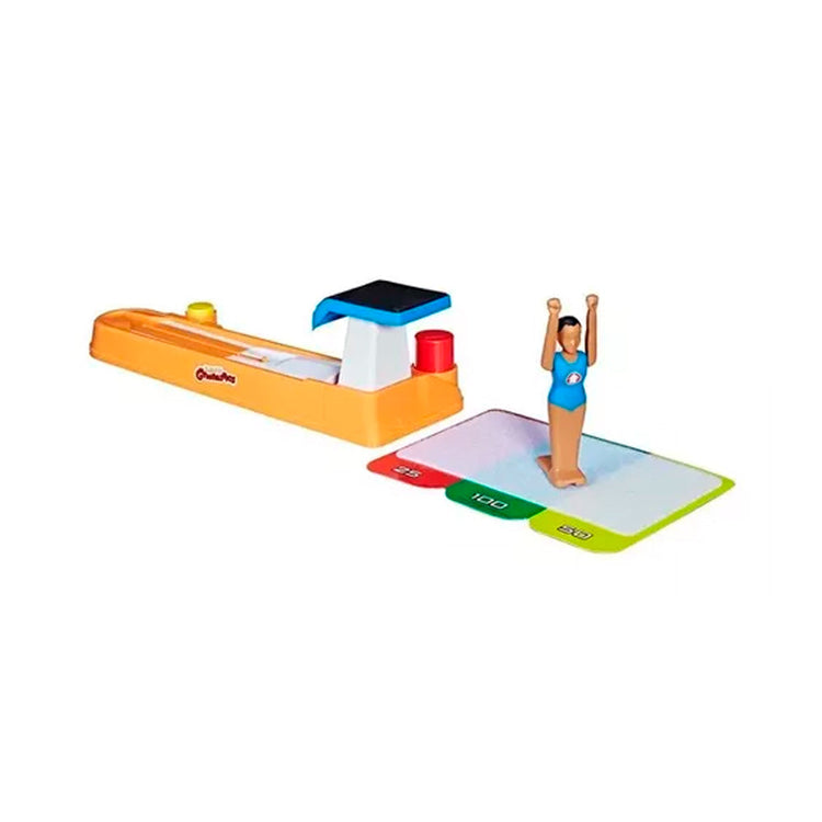 Suelta al gimnasta por la pista y que pegue el salto. ¡Logra una caída perfecta para ganar! La hoja de instrucciones paso a paso contiene sugerencias para obtener el puntaje perfecto de 100 puntos. Incluye figura de gimnasta, pista, tapete de aterrizaje e instructivo. Incluye cuadro de torneo. Para 1 o más jugadores de 8 años o más.