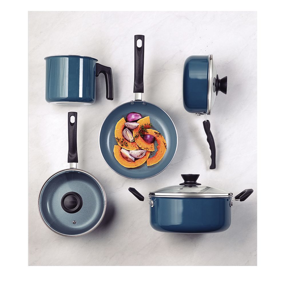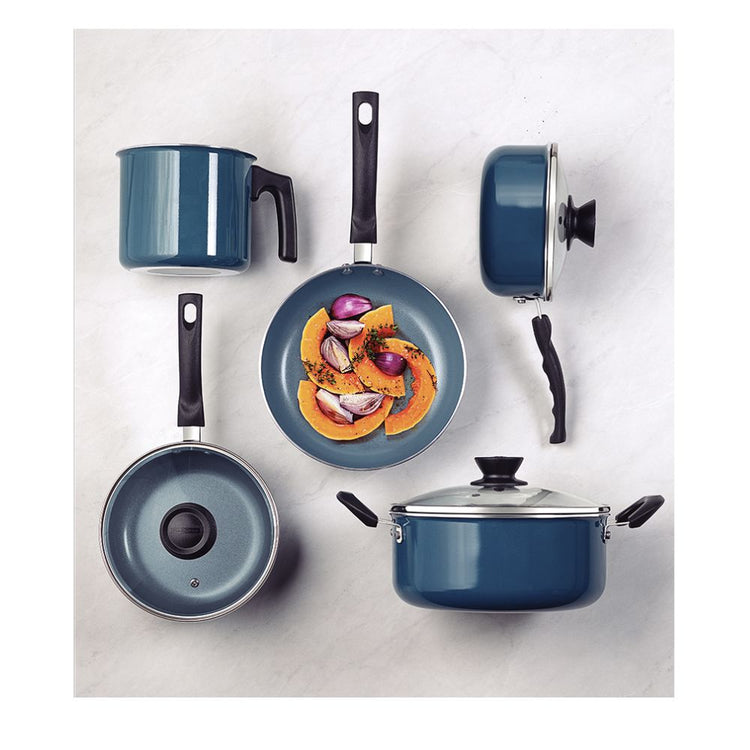 Con piezas producidas con cuerpo de aluminio con espesor que permite la cocción rápida y uniforme de los alimentos, posee un revestimiento interno cerámico y externo de silicona. Es un juego durable, resistente y perfecto para la utilización diaria. Los mangos y asas son de baquelita antitérmica y sus agarradores de nylon, no calientan y aumentan la seguridad y el confort durante el uso. Además, las tapas que se incluyen son de vidrio templado con salida de vapor y bordes de acero inoxidable, que ayudan durante la preparación y la observación de los alimentos. ¡Con Tramontina, obtiene los mejores artículos para su cocina!