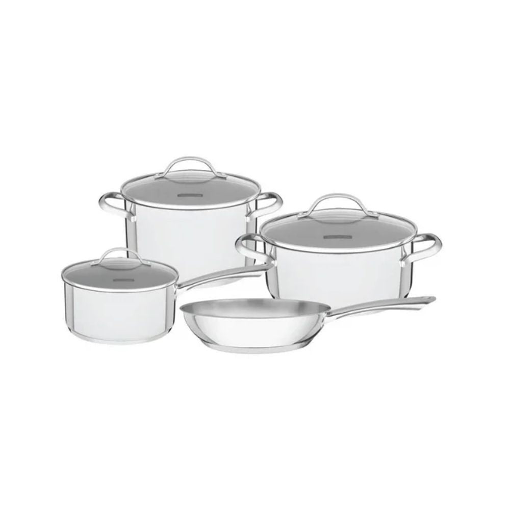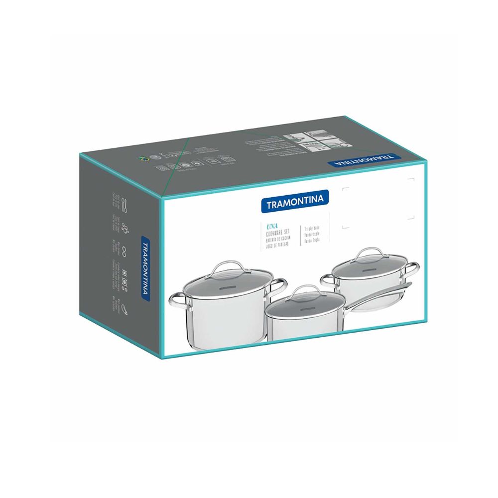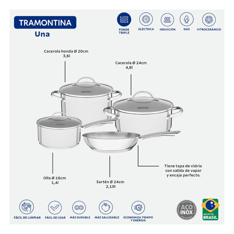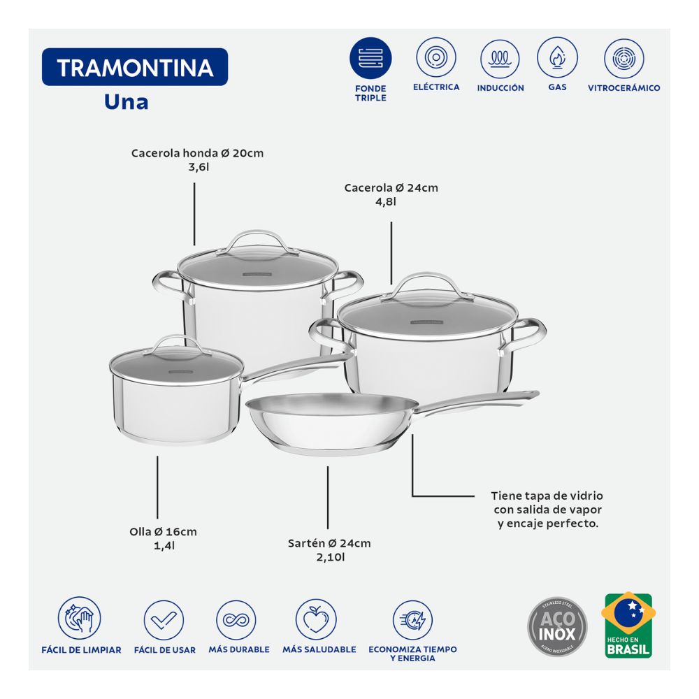 Tramontina ha lanzadp la batería de cocina, Una de acero inoxidable con fondo triple y tapas de vidrio 4 piezas Tramontina. Todas las piezas están hechas de acero inoxidable con terminación en alto brillo y fondo triple (acero inoxidable + aluminio + acero inoxidable), que distribuye el calor uniformemente, proporcionando una cocción más rápida y uniforme, ahorrando energía y manteniendo los alimentos calientes durante más tiempo. Las piezas poseen tapa de vidrio con salida de vapor y encaje perfecto, se pueden lavar diariamente en el lavavajillas. ¡Obtenga productos Tramontina y estará muy satisfecho en su cocina!