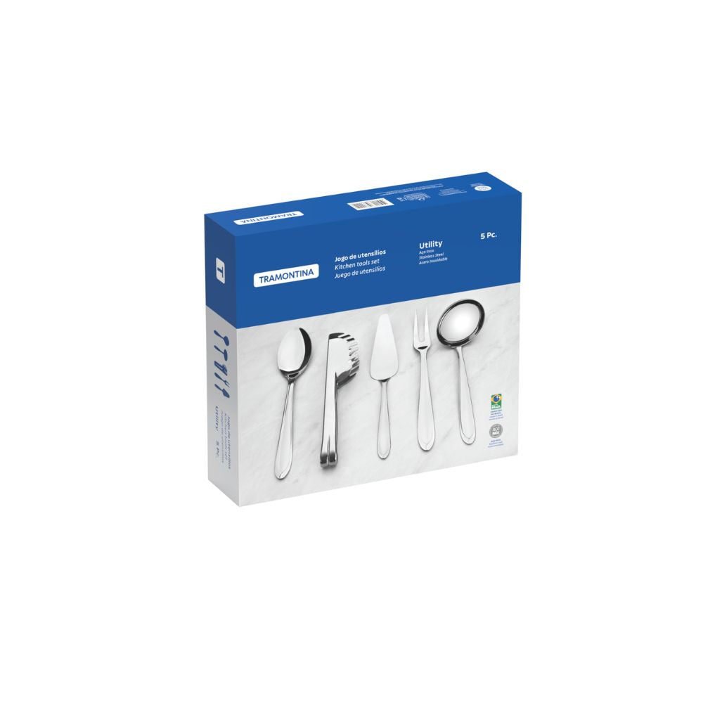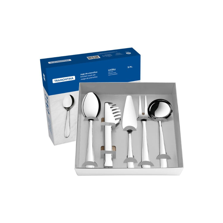 Los utensilios de calidad son indispensables en la preparación de platos sabrosos. El juego de utensilios Tramontina de acero inoxidable terminación brillante 5 piezas hace toda la diferencia en la elaboración de sus comidas. Totalmente hechas de acero inoxidable, las piezas de la línea Utility son altamente durables y combinan con cualquier ambiente. Los mangos proyectados proporcionan mucho más comodidad y seguridad en su manipulación. Apropiados para el uso diario, para limpiar basta colocar los utensilios en el lavavajillas.